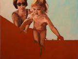 The technique used also issues from this subject. It is in fact variable, and can become an element of the meaning, or even a disturbing motif: the figures painted on sheetrock (Et in Arcadia Ego series) are made with a base of tar, with the bitumen gradually making the image disappear. The same goes for other series borrowing the image of photo stories or the kiss motif.