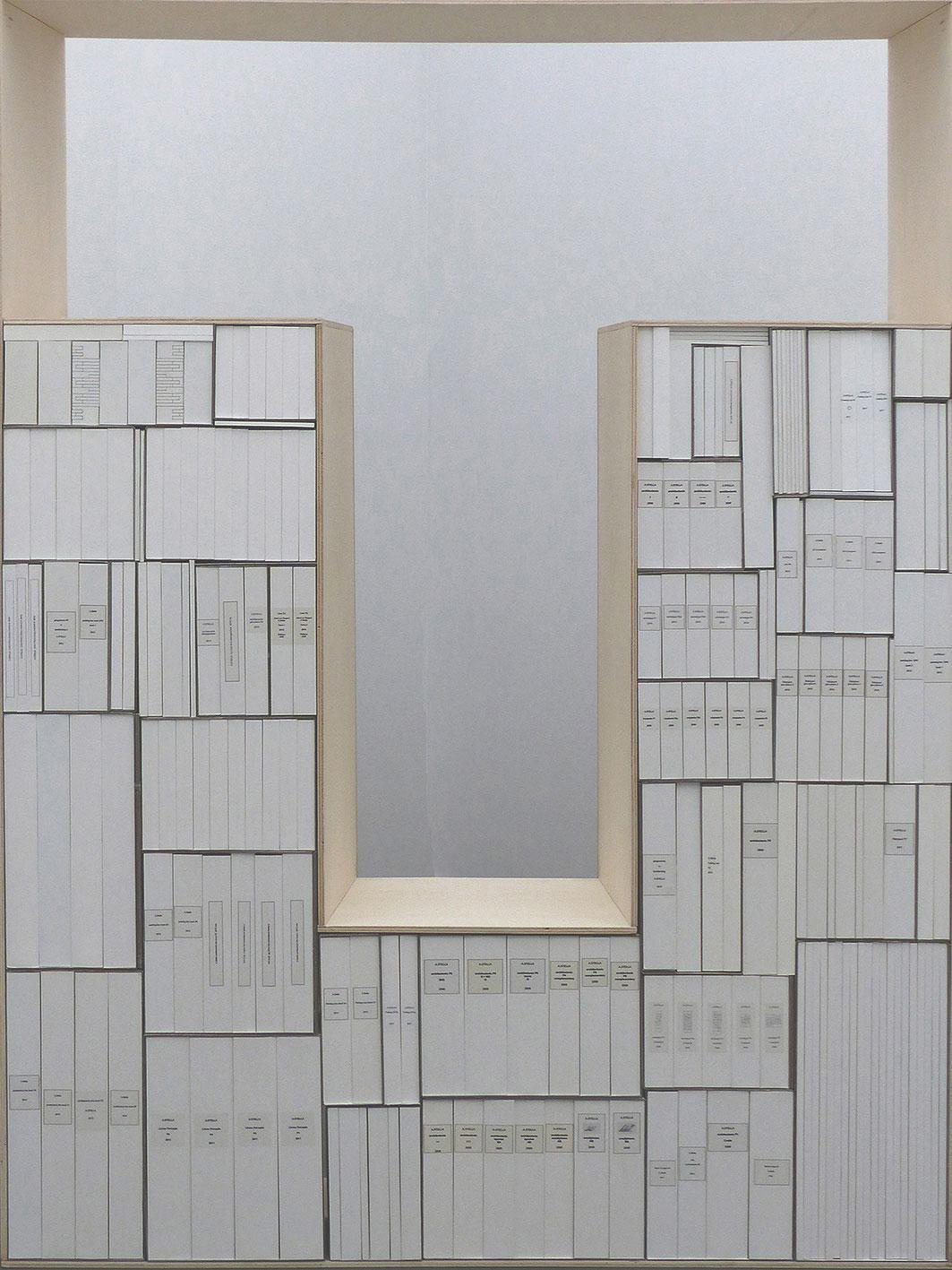 Moving from canvas to paper, A.Stella also moves to relief, and from two to three dimensions. So is this the “end” of the surface, its hollowing and convexity as volume, its sundering from flatness? Yes and no. “Through vertical incisions and horizontal articulations, with no additions or deductions, from one sheet of paper I raise up this new dimension. The incision/articulation acts on the back and front of the paper’s surface simultaneously, and produces the perception of two elements by their projection which places them one in the foreground, the other in the background”, the artist writes about her “Planogrammes”.