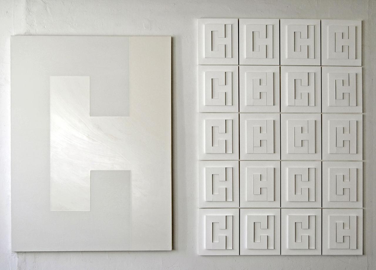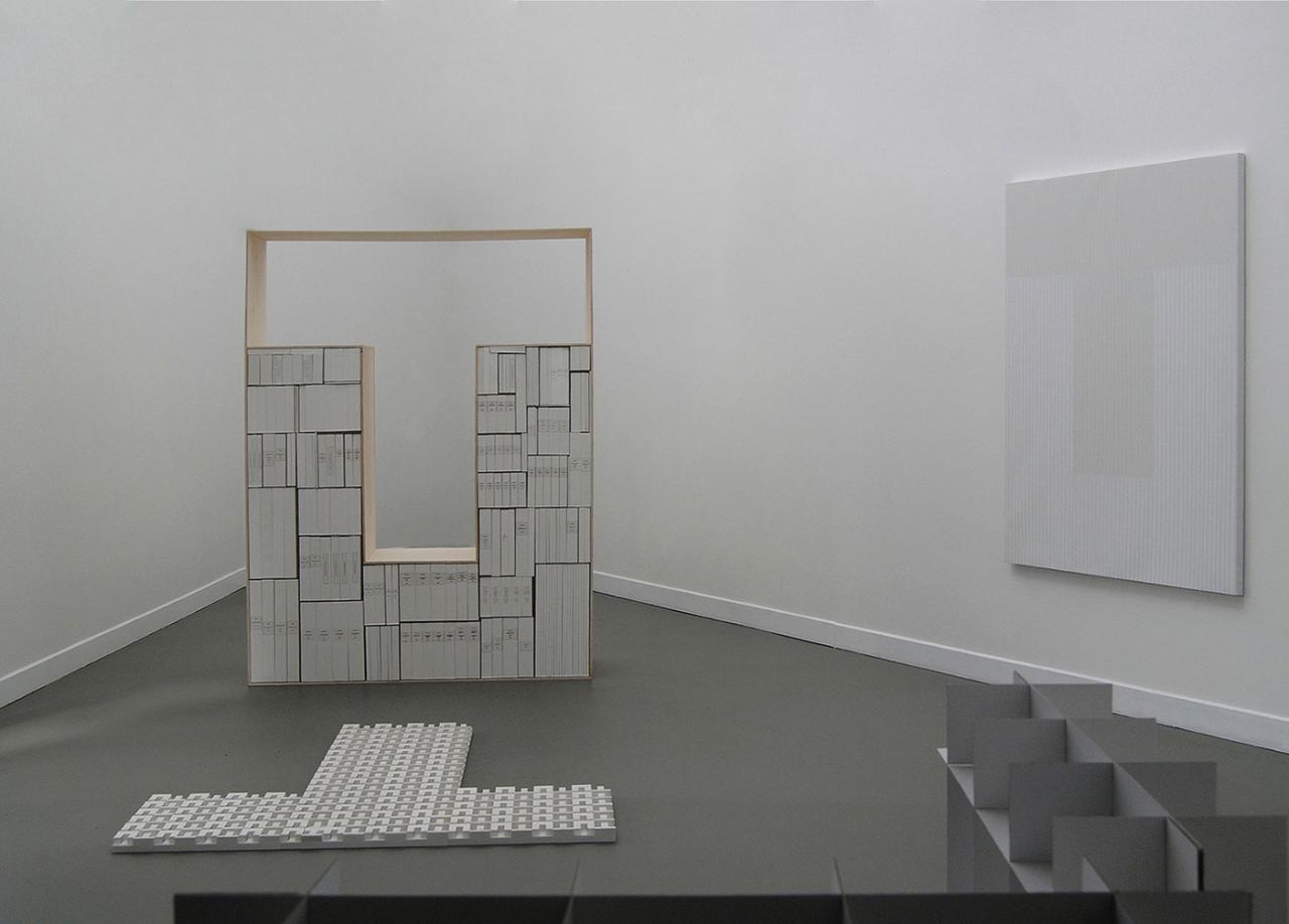 Like in a Beckett story, the world is reduced to just a few things, its essential spatial dimensions, and a little light and shadow… As it happens, this is A.Stella’s world: a surface, made of paper or canvas, and five geometric forms which look like five letters (п,C,Y,T,E). Five forms which, in the negative, each introduce their complementary “double”. This seems as straightforward as a handful of Euclidean axioms making a whole geometry possible, or as a few letters making a whole linguistic structure possible. On a rectangular canvas, a “grapheme” is, for example, painted glossy white, while its complementary is painted matt white. On a nearby canvas of the same format, the grapheme is painted matt white and its complementary glossy white. The two pictures form a “Geogramme” and, already, A.Stella’s geometric minimalism opens onto a perceptive abyss: solid and hollow are forever being reversed, as are style and content, and inside and out. And each picture can be regarded as a mirror image of the other.