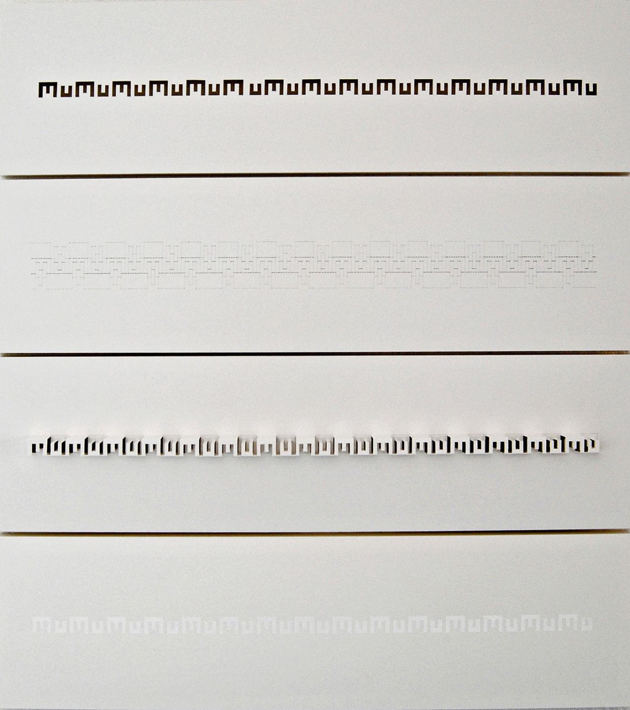This infinitely varied and infinitely light geometric tautology is, in my view, traversed by another dimension. The “graphemes” are spare forms, to be sure, but they are also quasi-letters.* They beckon (silent, indeterminate, fragmentary) to language, towards a possible articulation of an unknown word, a foreign language. A.Stella has produced many artist’s books which, for her, are another way of folding and unfolding forms and surfaces, and connecting them together. But beyond this they are nevertheless… books, and one cannot help seeing in them, symbolically, potential “texts”.