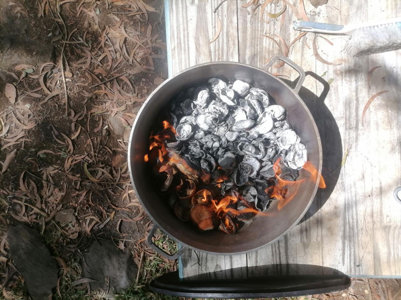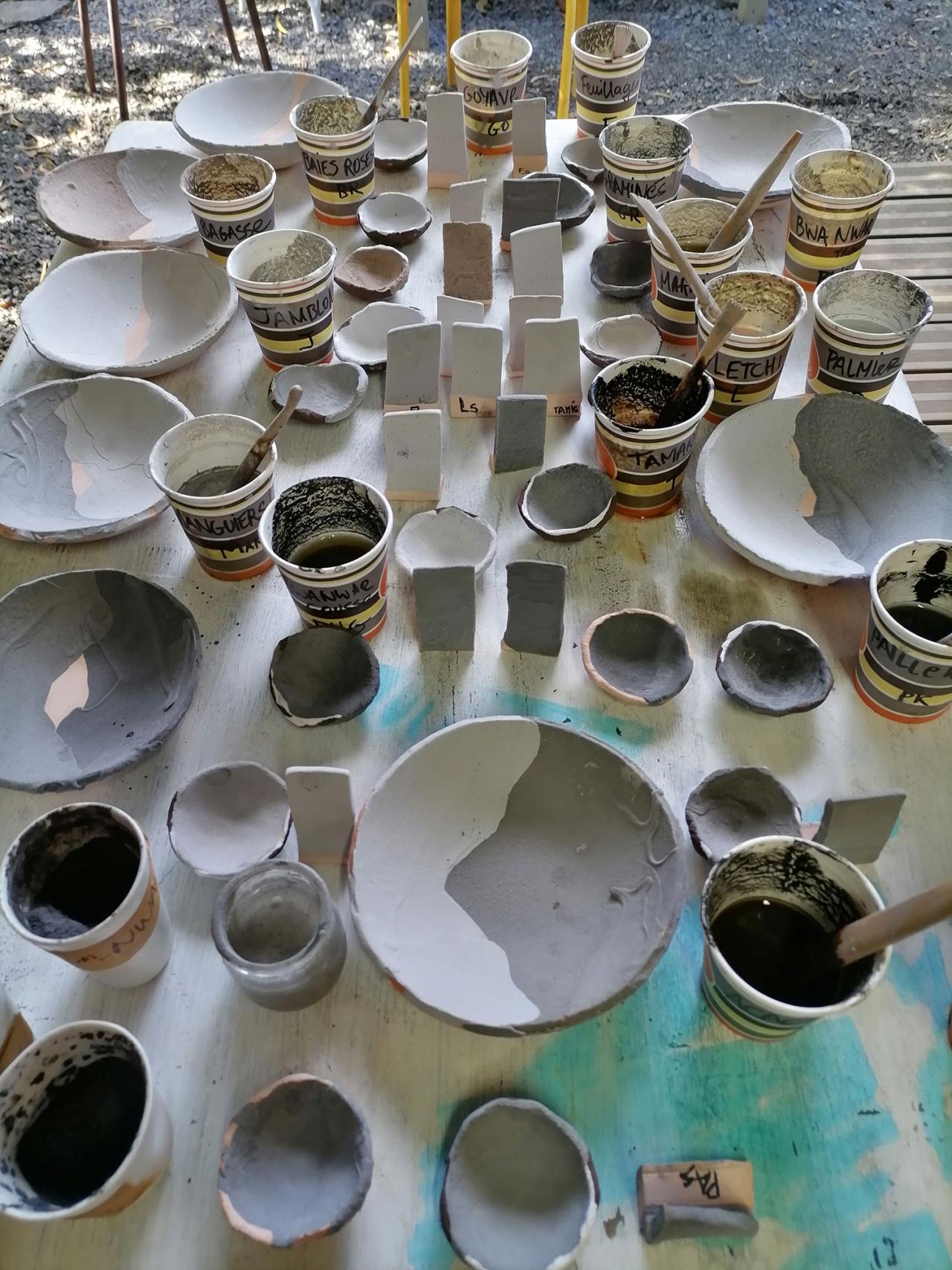 The garden is a living entity. From cool southern winter to muggy, boiling December, it beats in rhythm with the seasons. But the flamboyant vegetation shares quarters with all that will make it disappear tomorrow. Plumes of smoke rise through the air, a fire is lit in a metal container. The earth bears the marks of past fires, gone cold, or maybe still a little warm? The present one is white-hot, and the artist engages. She’s at work. From a rigorous selection of the skins, bark, leaves, pods and peels of occurring species, the vegetation begins its irreversible transmutation. Licked by flames, these multi-cellular organisms who, thanks to photosynthesis, can transform mineral matter from the environment into organic matter of their own, are swiftly shrunk to ashes to become mineral in turn. Alice Aucuit, keen on ancestral knowledge and trained in traditional as well as modern ceramic method, is conducting a territorialized study of vegetable ash. Starting from waste material (pruning waste, grapevine sarments, mowed hay, marsh plants, rice straw, coffee chaff, cut flowers), she draws on work carried out by the Bureau de Recherches Géologiques et Minières (French geological survey) on the soil and deposits of Réunion. The plant’s organic makeup, where it grows, the season and item harvested will determine the composition of the ash, then the characteristics of the glaze to be forged at high temperatures. Ash glazes, which appeared in China during the Zhou dynasty (-1100), were used to waterproof pottery. Today, they offer the artist a range of possibilities, both conceptual and visual, for realizing pieces.