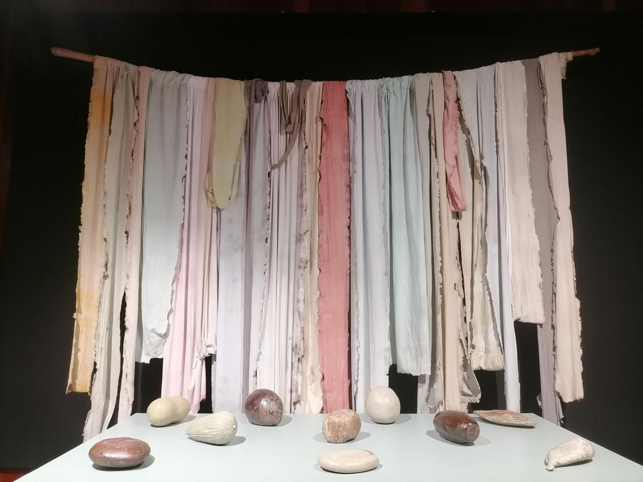 The work in progress echoes Le Cordon des Graines, created a few years earlier. The installation evokes the Roman myth of the Three Fates, deities who are the masters of human destiny, of birth and death. Some fifteen seeds made from Saint Amand clay, out of which a white glaze emerged, alluding as much to seminal fluid as breast milk, are displayed on traditional wooden machines used for weaving linen. Like Ariadne’s thread, the exhibition provides a metaphor on the possible paths of a life, between human construction and natural element, between direction and contingency.