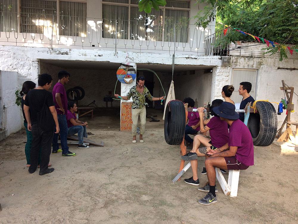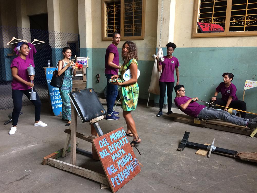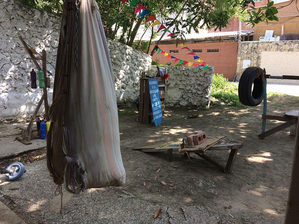 Using found materials—flotsam and jetsam, tins, tyres, bricks, composite materials—exercise benches, dumb-bells, and weights were all produced. This club took shape in various places and, first and foremost, during the Contemporary Art Fair in Barranquilla. On each occasion, visitors stopped, put on the club outfit and got down to exercising. The most rewarding factor was always people helping one another and finding the best exercises on that equipment conceived for functions which would, it so happens, be found at a later date. The last occasion, in the artist’s presence, took place in an open air garage, in the middle of the village hosting it, well removed from the art world! For a whole weekend, enigmas became objects of barter, and the garage became a living place; together, they created forms of love which they tried to share.
