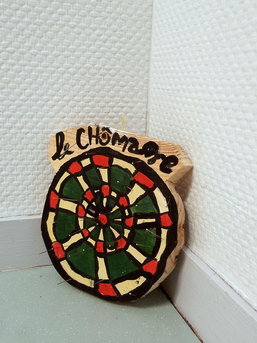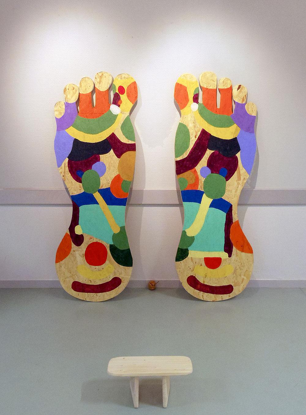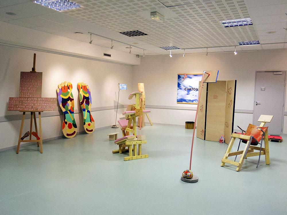 Rather than passing judgement on the maturity of these young people and their capacity to concentrate, Anaïs Touchot decided to create a well-being center for them, “a space which they can appropriate for themselves, and which they are responsible for, in perfect autonomy.” Sculpture in the form of massage chairs, paintings borrowing foot reflexology diagrams, a target riddled with nails, voodoo-fashion, nicknamed “unemployment”… All so many ways of encouraging their imagination and the appropriation of their bodies. It is, incidentally, on the basis of hunches that the artist uses the latest neuro-scientific discoveries: rather than showing them kittens (which inevitably causes endorphin to be released), she paints the word, permitting college students to themselves come up with the form which satisfies them. Her latest installation is intended to be a “bridge between body and mind”. So is this flesh/mind reconciliation not the main challenge of the 21st century? The only possible way for a generation so connected to technology to re-connect itself to the body of the other… and thus to its aspirations?