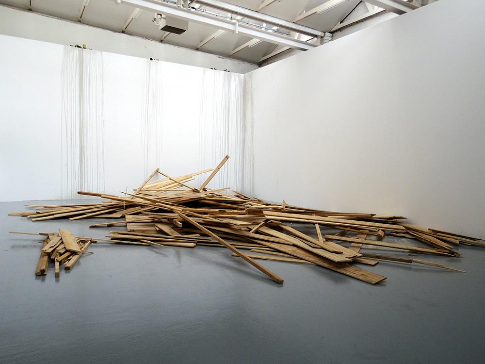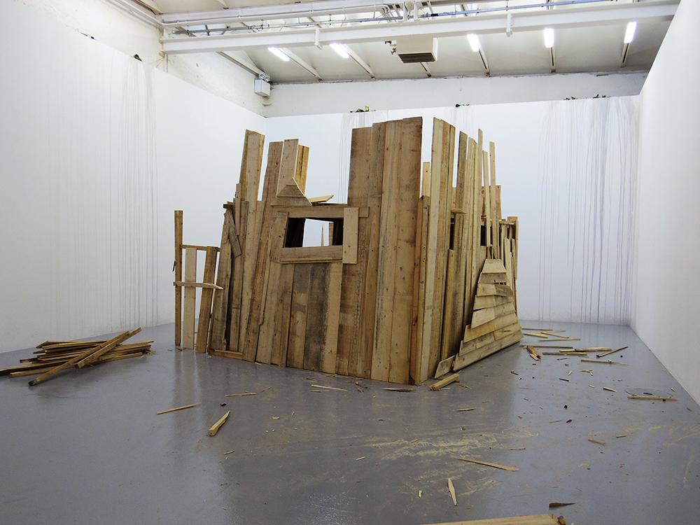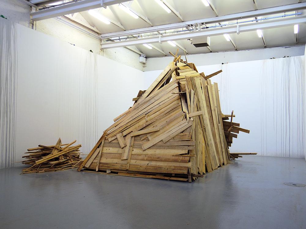 It is strength of will that shows through when Anaïs Touchot produces a work. The physical strength of a woman handling a mass in order to destroy; and the mental strength of a woman who is forever improving her work. Si j’étais démolisseur is not a performance. Nor is it a sculpture. It is a moment which she regularly repeats. While an exhibition is being put up, she constructs a wooden hut. On the evening of the opening, as at the CAN in Neuchâtel, she destroys it. Then throughout the exhibition, during opening hours, she reconstructs, only with what is there—with whatever is to hand. Without adding more nails or planks. And when evening comes, she relentlessly demolishes her construction. The better to give it back a form on the morrow. Needless to say, Anaïs Touchot derives a great deal of pleasure from developing the structure which is continually evolving: outwardly, we can nevertheless see her task as being like that of a contemporary Sisyphus.