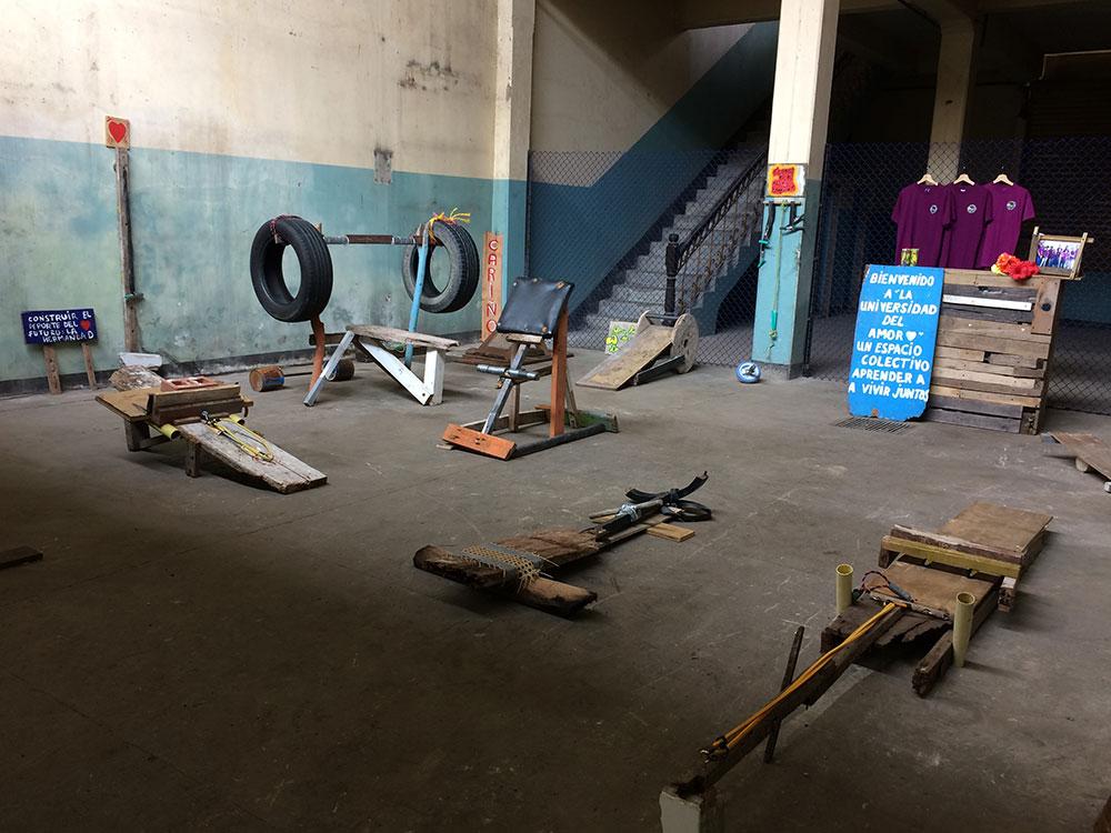 Anaïs Touchot sees in body-building a way which opens up avenues of responses. Her analysis of fitness is especially subtle: over and above being a question of statuary, looking at the body is a worldwide preoccupation. It is also one of the rare places where a women can show virility. The idea of opening a gym started to take shape: authorized virility, togetherness, friendship and cohesion were forever being emphasized. It was at that moment that it was proposed that she give a lecture. She arrived with T-shirts which she had flocked, with the idea of creating a group. The participants put them on, and a discussion about love, fitness and art got underway, and then grew into a workshop where gymnastic equipment was made: l’universidad del amor, a mobile body-building club, accessible to one and all, and free of charge, came into being.
