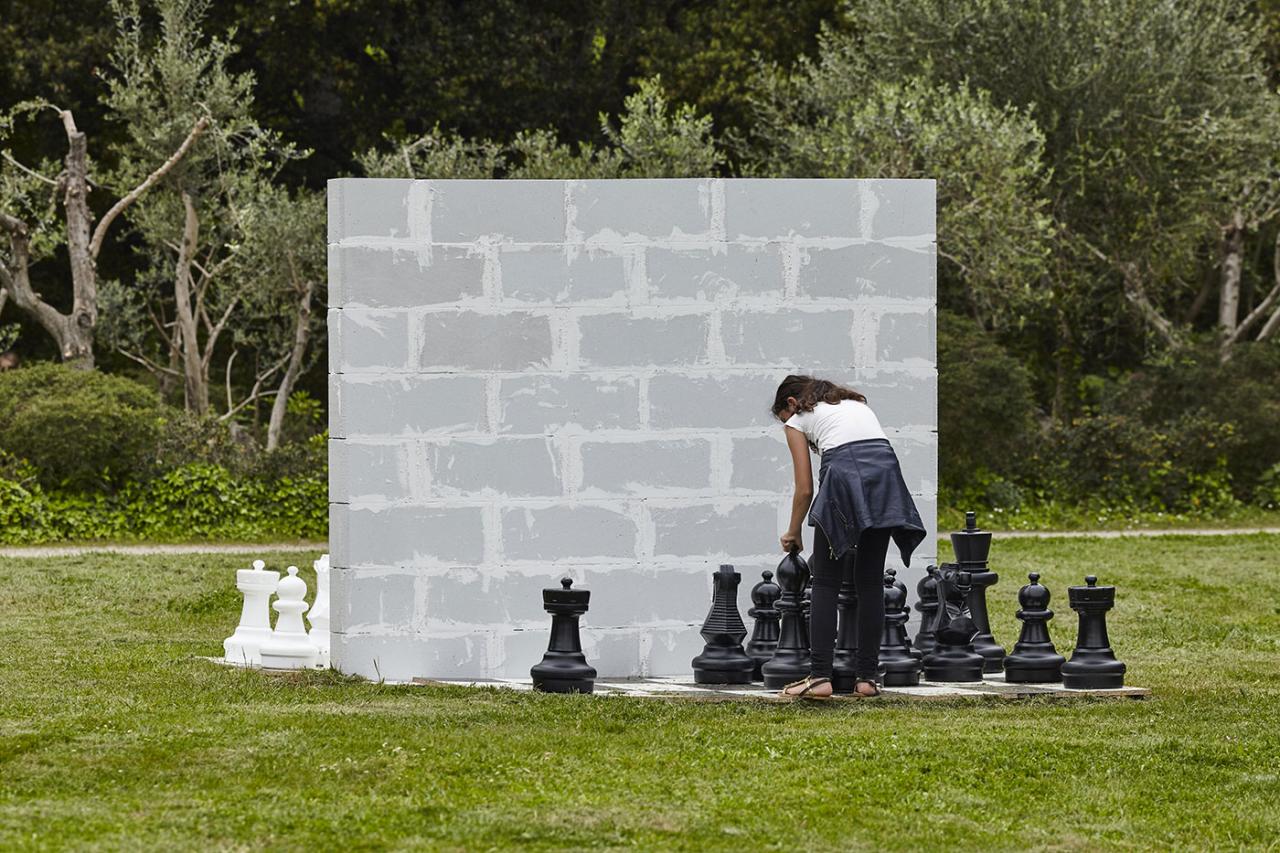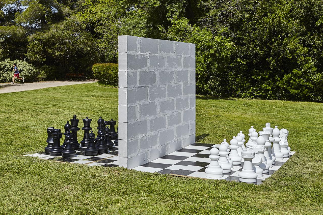 In 2017, Badr El Hammani produced a work titled Game of Chess. It is a sculpture depicting a chess board measuring more than 13 feet in length. The board is cut in two by a white wall which prevents the black pawns and the white pawns from meeting. At first glance, the game is literally held in check. The work summons up several notions: territories, the border, the wall, separation, weight, distance and blocked communication. Yet we must play this game of chess in order to invent strategies for bypassing an apparently thwarted and difficult situation. What is thus involved is creativity and disobedience, to deal with the impossible. In this in-between space, on either side of the frontier, Badr El Hammami invites us to encounters, negotiations, resistance, and the circulation of words, bodies, histories and memories. Through his works, the individual narratives encounter a collective history of plural migrations the memory of which is damaged, fragmented, silent. The artist thus remedies the relentless erasure of these narratives rendered invisible.