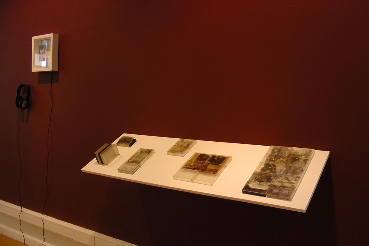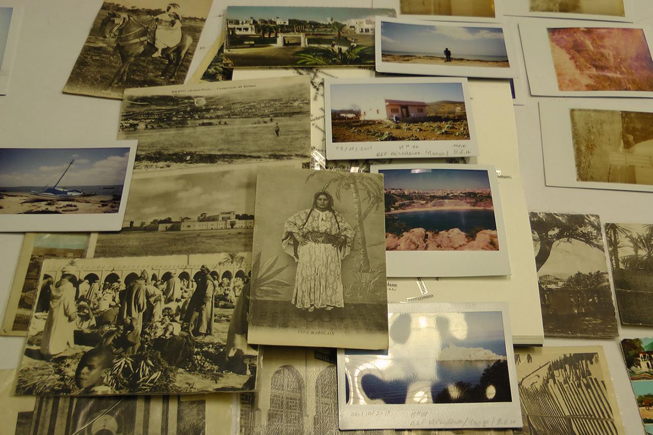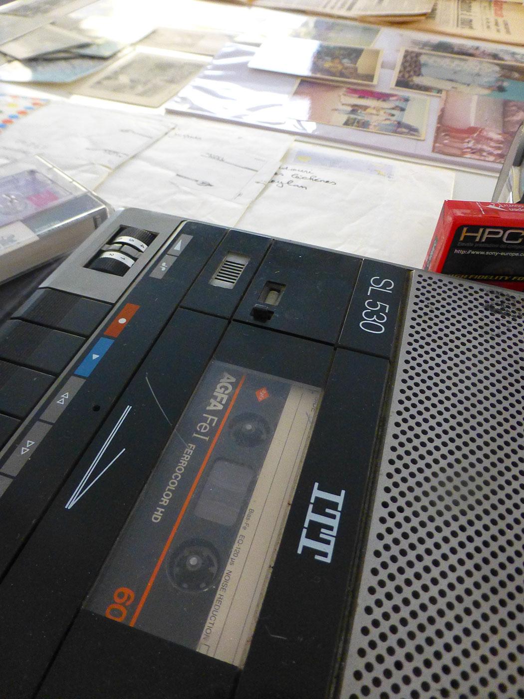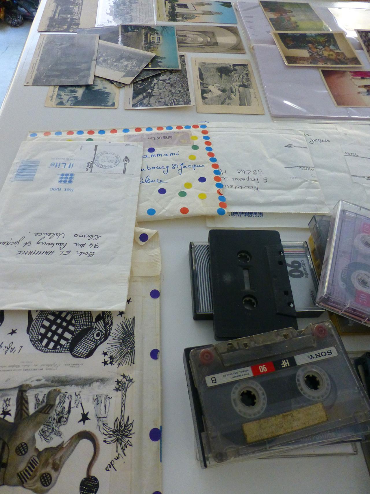 Departing. Leaving your home, your nearest and dearest, and your culture. Crossing the sea, crossing borders. Existing as a foreigner, somewhere else that you have not chosen. Not cutting ties. Nurturing memories. Nostalgia. Dreaming of a return. Departures are part and parcel of human history. They involve sacrifices, hope, money, and complicated feelings caused by an interstitial , in-between situation. It is in this space, which is hard to determine and identify, that Badr El Hammami develops his visual, critical and conceptual line of thinking. Part of his family, hailing from the Rif, in northern Morocco, left that country and settled in France in the 1960s and 1970s. The artist is specifically interested in the means of communication between those who left and those who stayed in Morocco. Because illiteracy is widespread, messages initially travel by word of mouth. In 1961, Phillips marketed a radio-cassette player. This device would become a quintessential tool for recording conversations between one family and another. Audio-tapes cross borders, conversations are constructed in the time taken by these postal to-ings and fro-ings. Into the tape boxes are slipped photographs and other small documents which, over time, will become the archives of a diaspora.