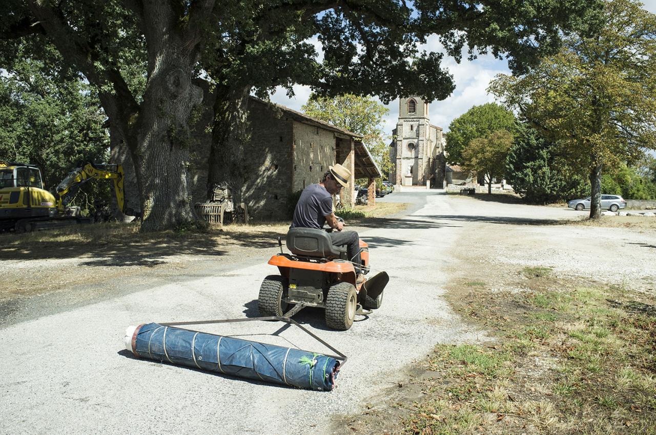 HS: Yes, they make up the large patterns with bright colors. But what we were interested in for this project was creating a collective event. At the start of the residency, we asked the locals to help us adapt a production technique used by Mongolian nomadic peoples. It consists in wrapping the wool to be felted around a tree trunk and having it yoked to a camel or horse to be carried across a long prairie. One of the locals was a mechanic and built us a great hitch adapted to fit his mowing tractor. Essential to obtaining felted wool is condensing and compressing the material. We had very little information on the weight, time and distance required in order to succeed. We based things on a few pieces of information we’d found online and estimated the number of roundtrips needed from the water tower to the church located at opposite ends of town.