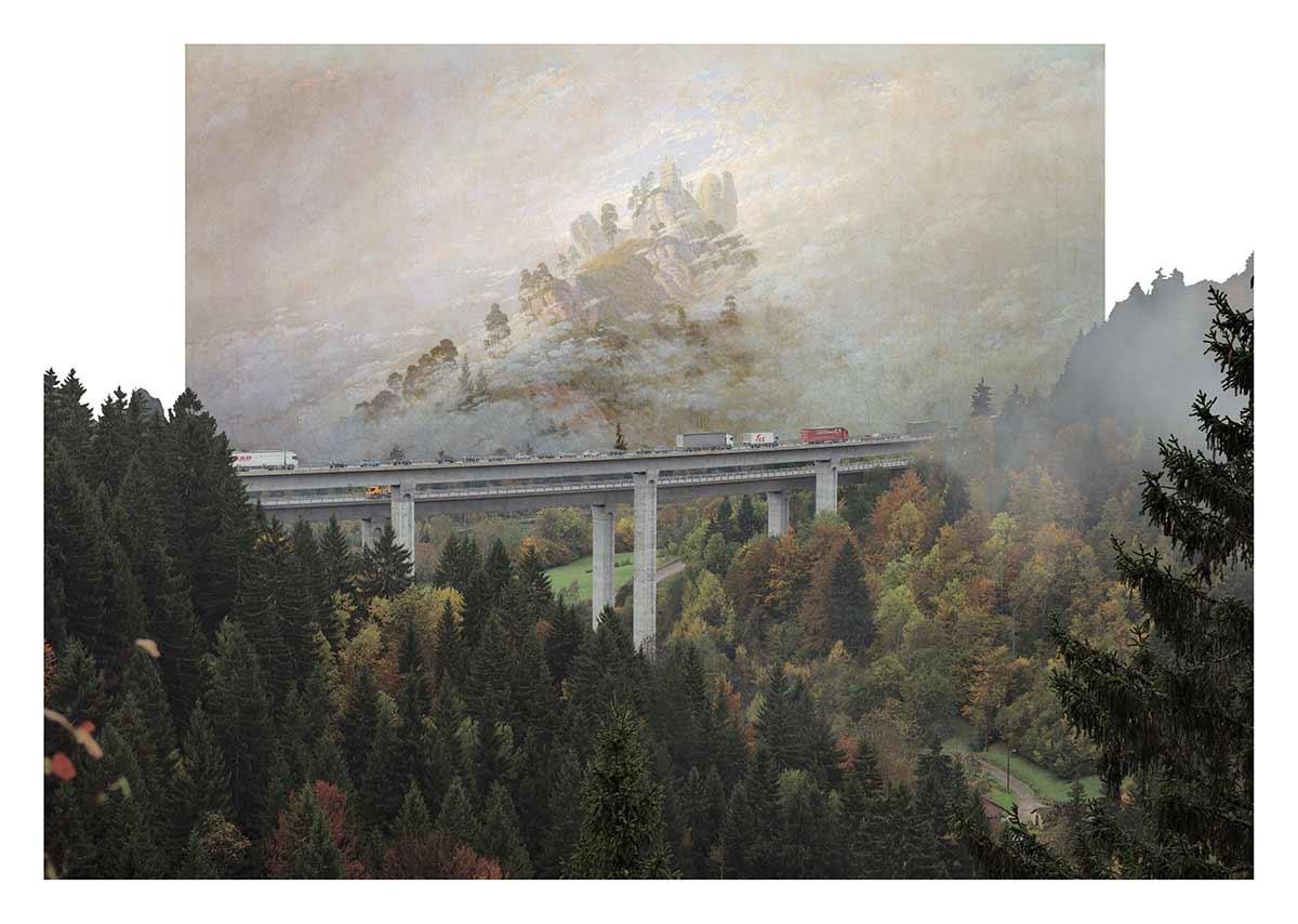 Through a subtle interplay of photomontage, Falco hybridizes many different sources, high definition of Friedrich paintings and current imagery. In these “layered” landscapes, two time-frames collide: Friedrich’s, which is idealized, and the snapshot one of our uses of the contemporary world. Here the artist advocates the idea of a “double vision” being overlaid on reality. He often proceeds in this way using an image, the way he would so with a palimpsest, and in subtle interplays of collages, scales, associations of ideas, and formal or temporal superpositions…he gives rise to the creation of new readings.