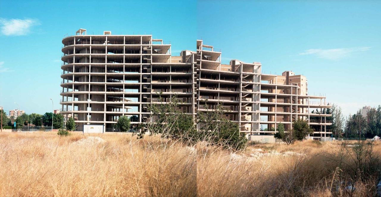 In Spain from 2010 to 2011, Aroussi produced the series Edificios Parados, exploring construction that came to a halt during the housing crisis. Construction sites are presented as instances of contemporary life: sites of manual labor and capitalist exploitation.