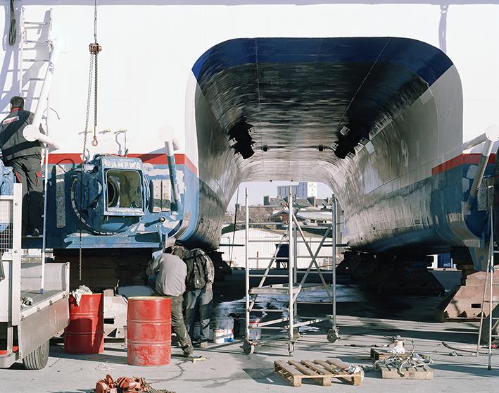 De fait, plusieurs séries de Daniel Challe portent sur les transformations de nos cadres de vie et de travail. Lorsqu’il se saisit du paysage à la fin des années 1980, il semble davantage marqué par l’observation critique des Américains comme Robert Adams et Lewis Baltz réunis dans l’exposition New Topographics : Photographs of a Man-Altered Landscape (Rochester, 1975) que par les recherches plastiques autour du paysage rendues possible par la Mission photographique de la Datar qui, en France, a marqué la décennie. Il s’intéresse alors aux chantiers qui bouleversent les paysages et montre les zones périurbaines allemandes ou les Alpes comme des territoires en mutation. Ces dernières années, il a installé sa chambre photographique à Keroman, port de Lorient marqué par des opérations d’urbanisme et les évolutions de l’économie portuaire, et à Malensac, petit bourg du Morbihan dont l’activité industrielle passée de site de production d’ardoises se lit dans les paysages environnants.