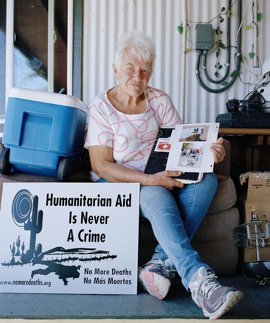 Gayle Weyer’s, Ajo resident, holding a folder in which she collects photos of human remains discovered in Aqua Prieta area, Ajo, AZ, May, 2019.