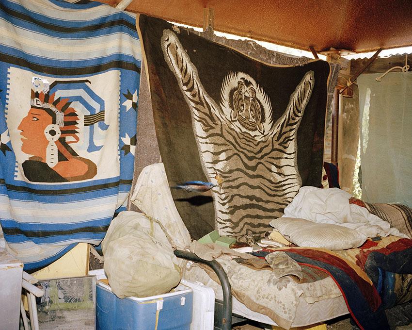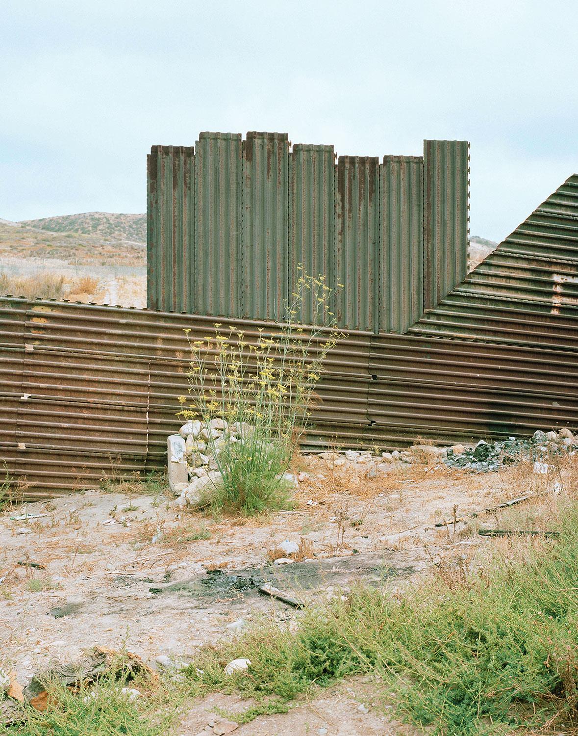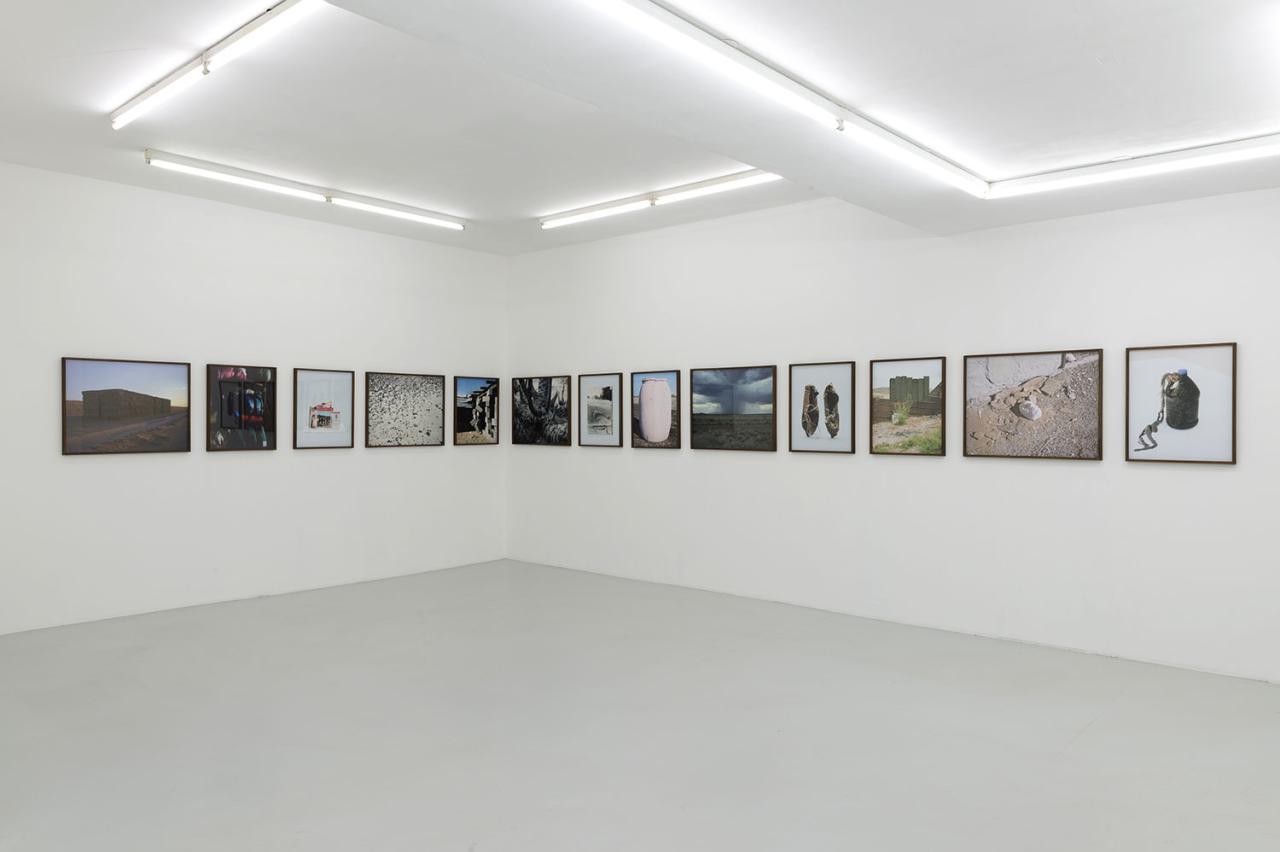 The photo of a crack in the ground retains something indeterminate. Resembling a scar, it seems to re-sew two areas of land together as much as it divides them. The artist associated it with the Japanese art of kintsugi: highlighting flaws in gold instead of concealing them. This is a photograph with a high symbolic coefficient, rubbing shoulders with photos of thoroughly tangible signs left by migrants, indicating an extreme degree of dereliction: a photo album, a dried plant on a grave, a makeshift shelter abandoned by miners, and re-used by migrants, miraculously flown over by a bird at the moment of the shutter click. A horde of small objects picked up in the desert by a member of No More Death are displayed on his dashboard like a handful of apotropaic talismans (warding off bad luck).