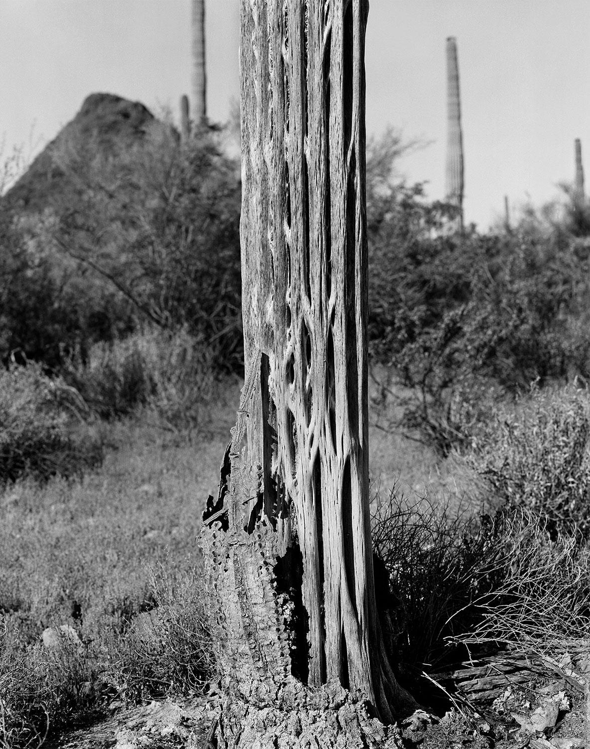 The other part of the images are views of organ-pipe cacti, a protected species in Arizona, whose longevity suggests that they have grown successively first on one side of the border, then on the other, based on the adage of the Tohono O’odam Indian nation: “We didn’t cross the border, the border crossed us”,6 for whom arbitrarily altered borders have caused social catastrophes. As figures of a passive resistance, produced in black and white, the organ-pipe cacti are also depicted dead, lying on the ground, immense bodies with an almost mineral texture, receiving, like the water cans, a corporal projection on the part of the viewer, this body that the artist conjures up and senses in the border: “The images brought together form a cryptography, expressing, each in their own way, the fact that there is a complex relation between those who “are one with” and the desert, an abstract and absorbing landscape”.7