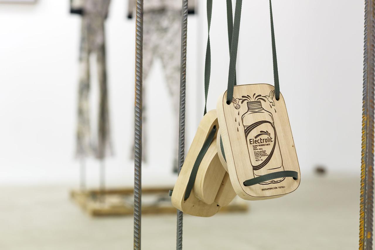 The chapter “Trails of Sasabe” alternates views of objects and landscapes, in an allegorical system which encompasses references to history as well as input to do with sampling: history, for those mustard plants which arrived here in the 16th century, sown by missionaries to stake out the settler’s trail, the image of the desert floor, somewhere between reconstruction and abstraction; it would be re-used in textile printing on amazing and inspired camouflage overalls, borrowing a use made by migrants with an appropriate distance. Enigmatic images, at first glance, which inform a basic part of Florent Meng’s work: the question of human displacement in arbitrarily drawn territories, the traces of which still get in the way of the course of human lives. Through a distancing effect, the harshly realistic photos of objects are taken in the studio, out of context: a water container complete with a handle made of worn rope, fragile soft shoes sewn in fabric, a booklet of tips for migrants published by the Mexican consulate, and survival items in a shop on the Mexican side of the border. A few hundred miles from the town of Sasabe, there is no border wall; the line is easy to cross, but lots of people die from dehydration well before they get to Tucson, in southern Arizona.