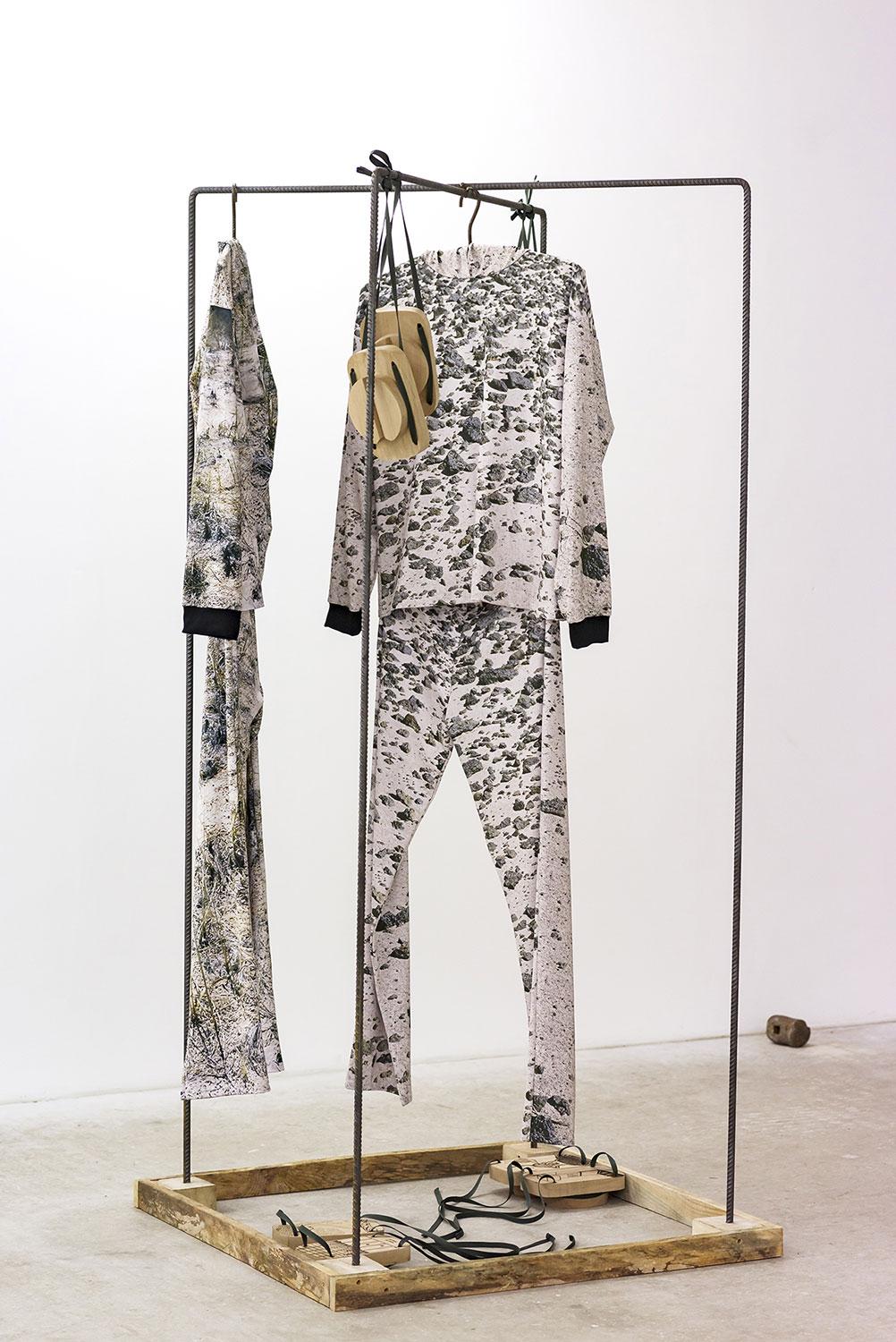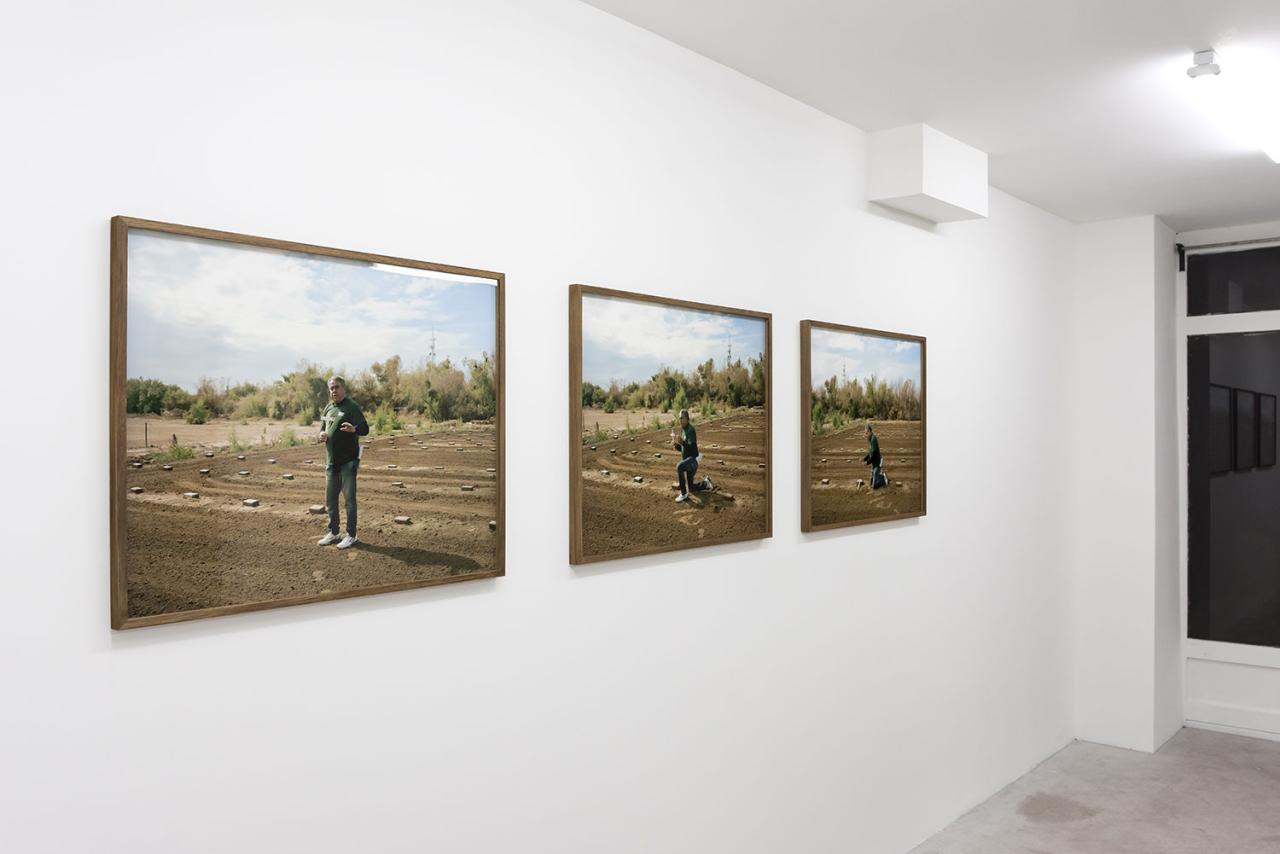The iconic and visual media and styles at work in AZ/SN (photos, films, writings, sculptures) also trace moments of life, the mirroring of situations in which the artist is affected in a cognitive and bodily way. Some objects are obvious witnesses to this, like the camouflage overalls, their cloth printed with an image of the desert floor, presented empty in the show, and upright. Taking (or not taking) photos, and transforming them, comes afterwards, to approach the subject that runs through his oeuvre: the democratic illusion and the repressed content it produces.