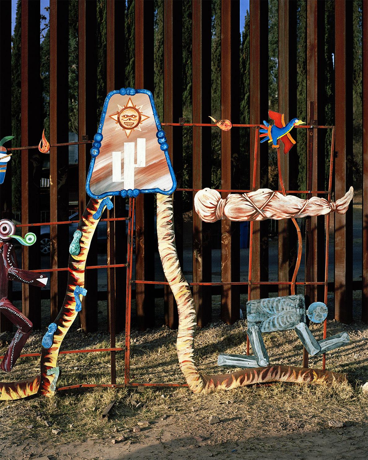 This series is organized in sub-sets which proceed from clue to symbol to narrative, involving, through these semantic styles, several systems for image reception. The first, titled Trails of Sasabe, came into being from the artist’s 1000-mile wanderings on both sides of the border. Sasabe, which is the last border village before the Mexican frontier, situated to the north of the Altar valley, has seen its economy grow thanks to passing migrants.5 This is a somewhat sinister detail, when we associate it with the deaths reported day-in day-out on the other side of the border, caused by climatic conditions. But the entire border ecosystem is based on double meanings and contradictions: the NAFTA free trade agreements (1994) resulted in the liberalization of the land market in Mexico and the eviction of thousands of small-time farmers and countryfolk, no longer able to subsist. These latter, and more generally the impoverished populations of Central America, often under the yoke of drug cartels, have immigrated on a massive scale to the USA, despite many a warning shot from the American government (the Obama and Trump administrations), which has introduced enforced deportation (shipping people back home) and heavy penalties. An ever-growing number of laws now tend to criminalize illegal immigration; but the American economy needs cheap labour on a daily basis, and this manpower is transported across the border from Mexico, from dawn to dusk…