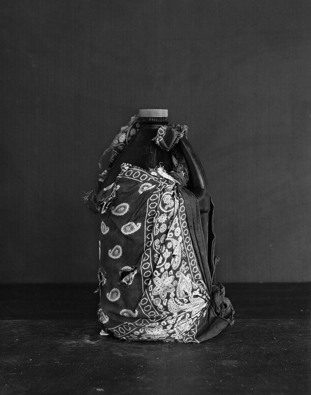 The starting point for the IV series is a collection held by Debbie McCullough, a member of the Samaritans, who has been criss-crossing the desert for the past twelve years to place water supplies in critical spots. The very idea of collecting things abandoned by dead people is problematic, especially in a private sphere which relieves it of its possible historical and political scope. Florent Meng photographs some of these things in his studio, in black and white: water containers wrapped in cloth.