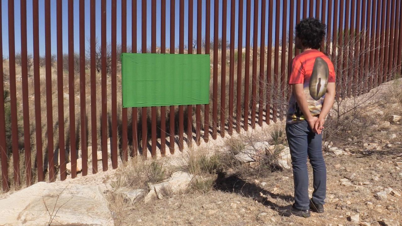 This film was shot in the Mojave desert along the border, with these two immigrant characters. Their long walk in the Sonoran desert gradually sheds its reality and nudges the scenario towards fiction. The weariness of the bodies, the crushing immensity of the landscape, bolstered by literary and film references, make the viewer shift towards a mirage-like sensation--put at an accentuated distance by the artist, who introduces visual arrangements like mirrors and green backgrounds2 unfurled in the landscape, suggesting an adjournment, a duplication of the image, and an absence. The film’s principle—crossing the border—effectively leads to an outburst of reality when one of the participants, a ‘dreamer’,3 does not want to be part of the shoot any more, afraid of being arrested if he gets close to the border.