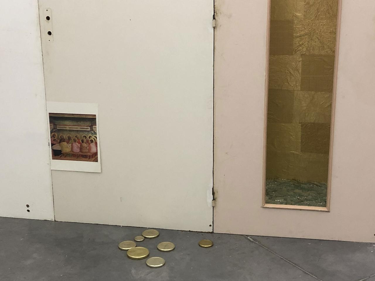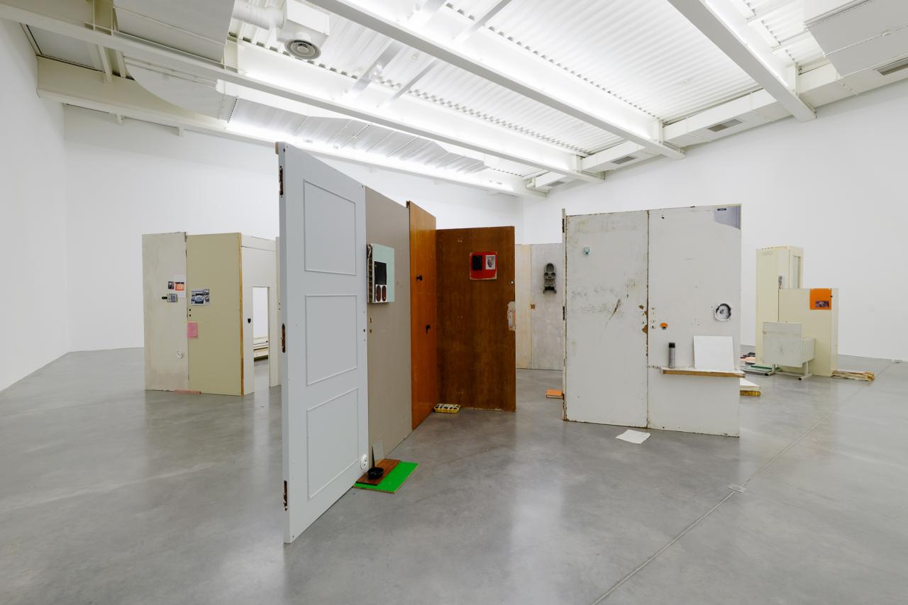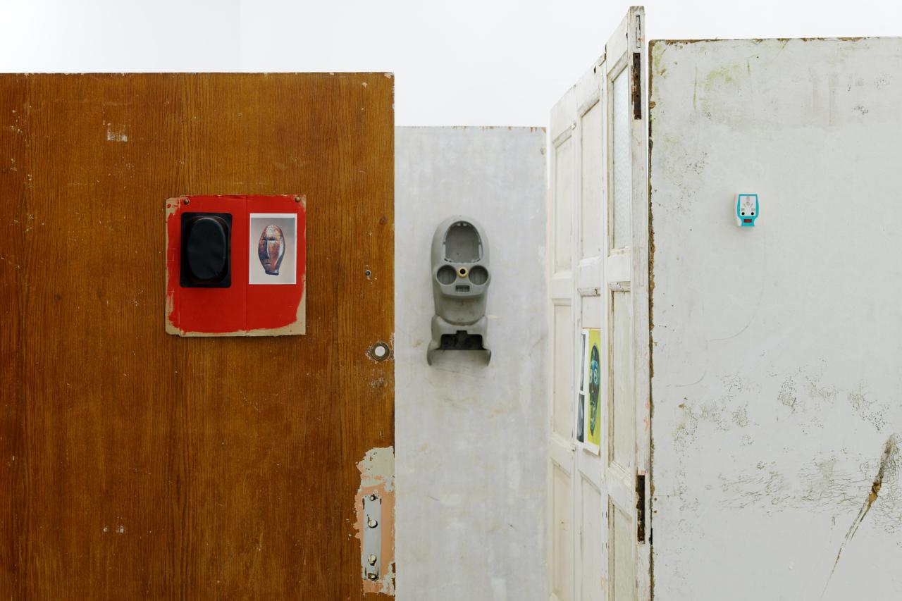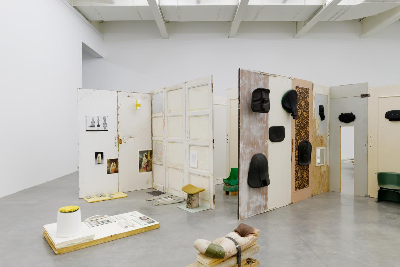 Folded in half on the floor, a scratchy cream bath towel serves as a plinth for a series of ice scrapers. Carefully arranged, the varied shapes evoke a new kind of hieroglyphs. Immediately beside this strange convergence of uses—bodily hygiene and automotive visibility—a modest collection of flat screwcaps are strewn on the ground like forgotten coins, with their deliciously antiquated gilded halo. Compelling in its nonchalance, this detail of the assemblage appears amidst a succession of doors, windows, and partitions that create alcoves, corridors, thresholds, and such. The makeshift architectural forms give a certain rhythm to our transit through this space, a hybrid between the ruins of a soviet building and an ikea display: the Swedish brand’s central concept is to give the illusion of multiple choices for the interior of the same house. Francesco Finizio calls these multiple entry signals that punctuate his labyrinthine installation Go Ghost ! (2021) at Frac Bretagne “punch lines,” witticisms or Freudian slips dictated not by the interplay of language but by the objects themselves.
