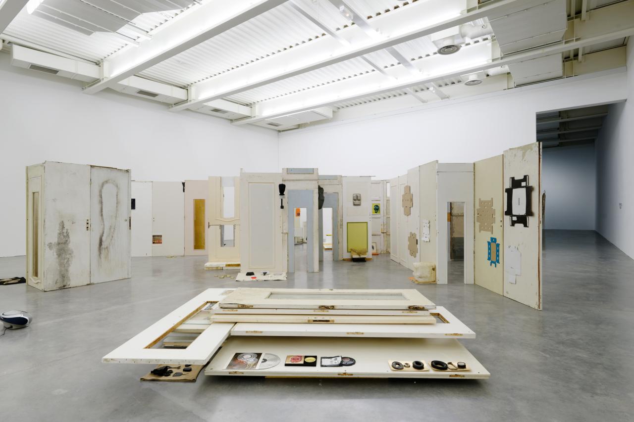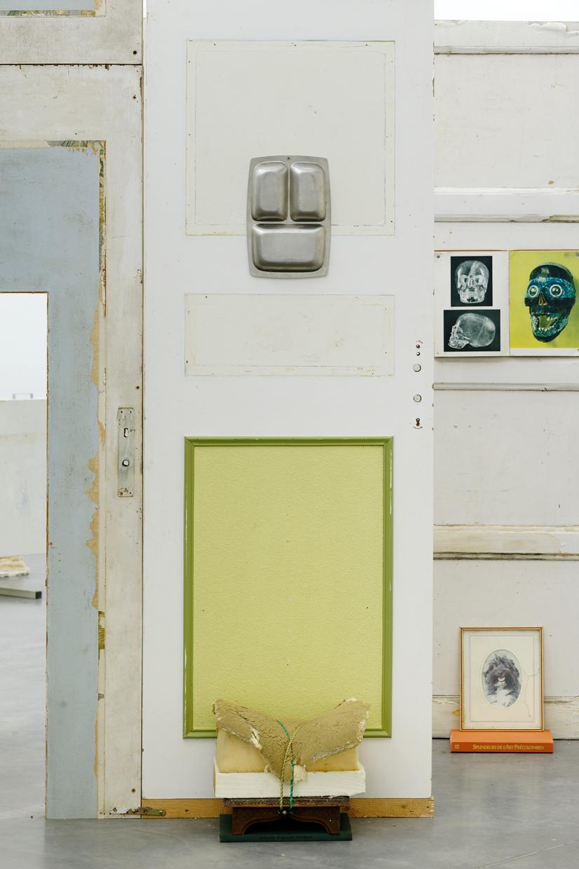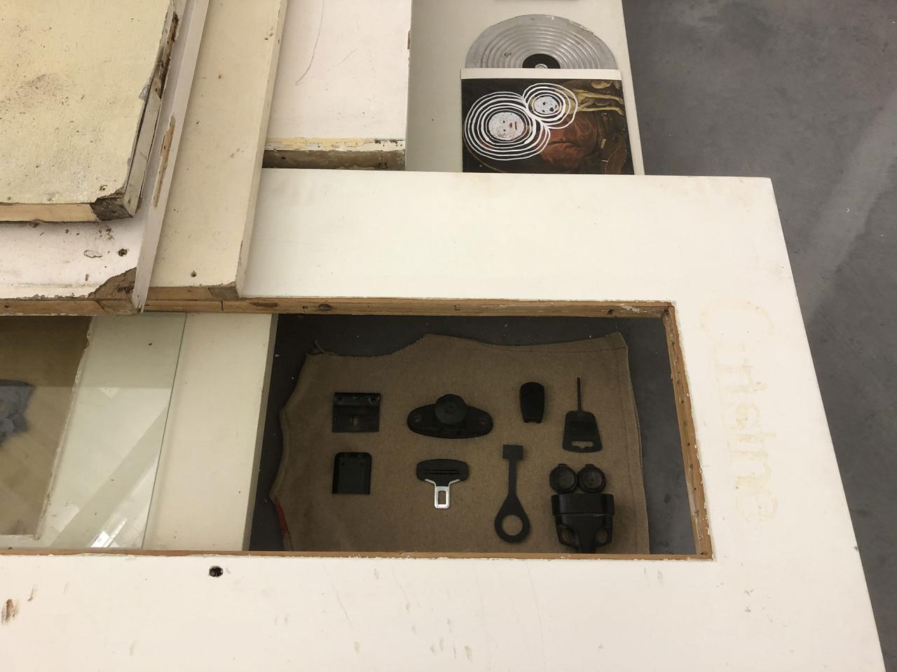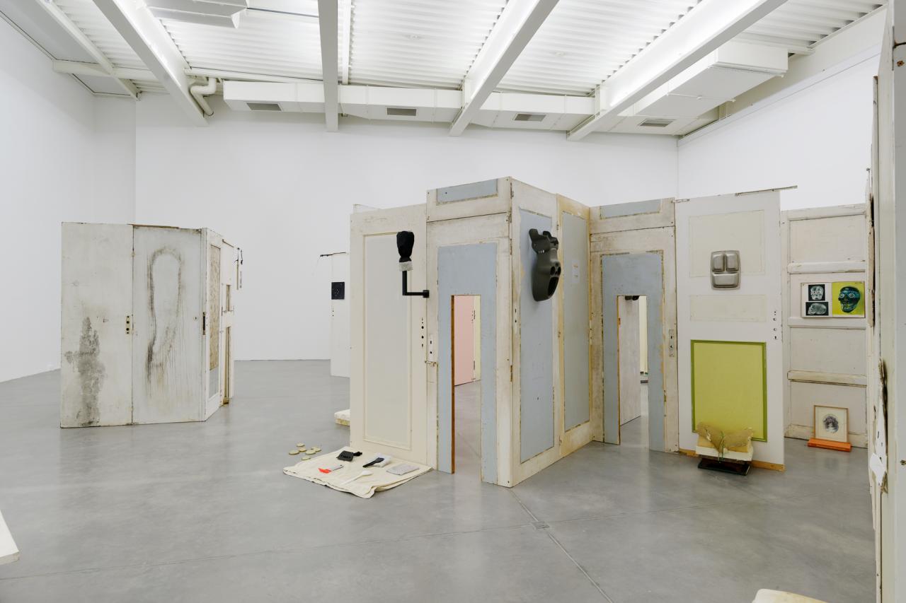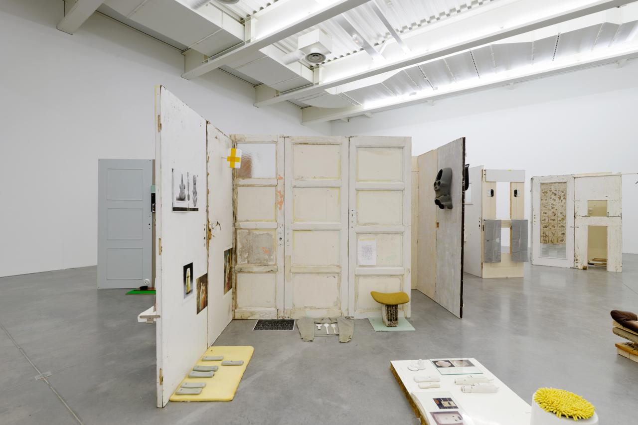 Folded in half on the floor, a scratchy cream bath towel serves as a plinth for a series of ice scrapers. Carefully arranged, the varied shapes evoke a new kind of hieroglyphs. Immediately beside this strange convergence of uses—bodily hygiene and automotive visibility—a modest collection of flat screwcaps are strewn on the ground like forgotten coins, with their deliciously antiquated gilded halo. Compelling in its nonchalance, this detail of the assemblage appears amidst a succession of doors, windows, and partitions that create alcoves, corridors, thresholds, and such. The makeshift architectural forms give a certain rhythm to our transit through this space, a hybrid between the ruins of a soviet building and an ikea display: the Swedish brand’s central concept is to give the illusion of multiple choices for the interior of the same house. Francesco Finizio calls these multiple entry signals that punctuate his labyrinthine installation Go Ghost ! (2021) at Frac Bretagne “punch lines,” witticisms or Freudian slips dictated not by the interplay of language but by the objects themselves.