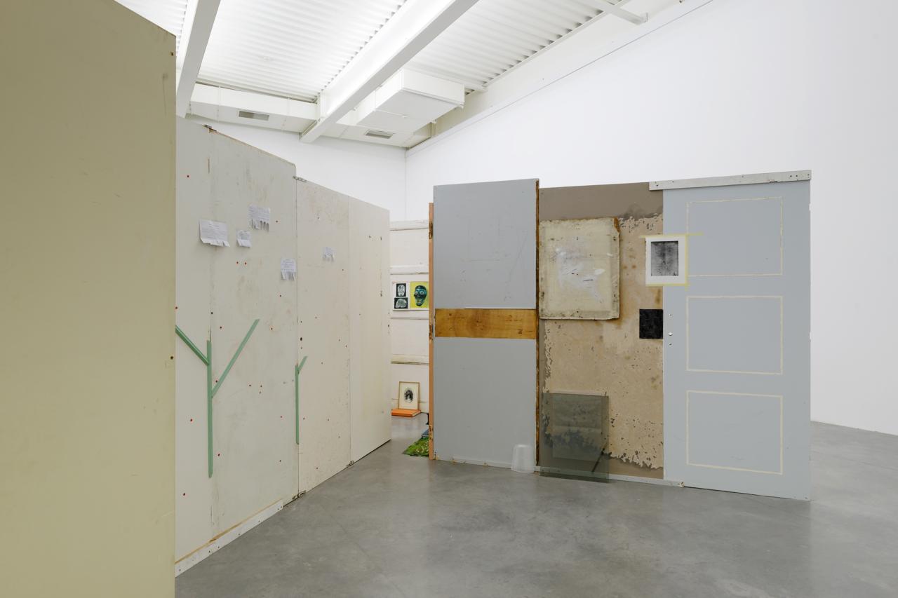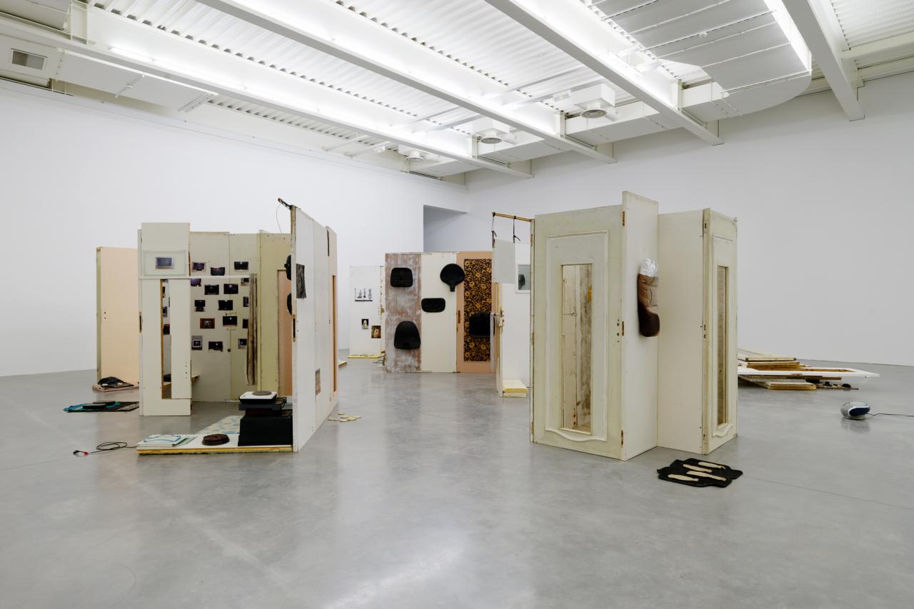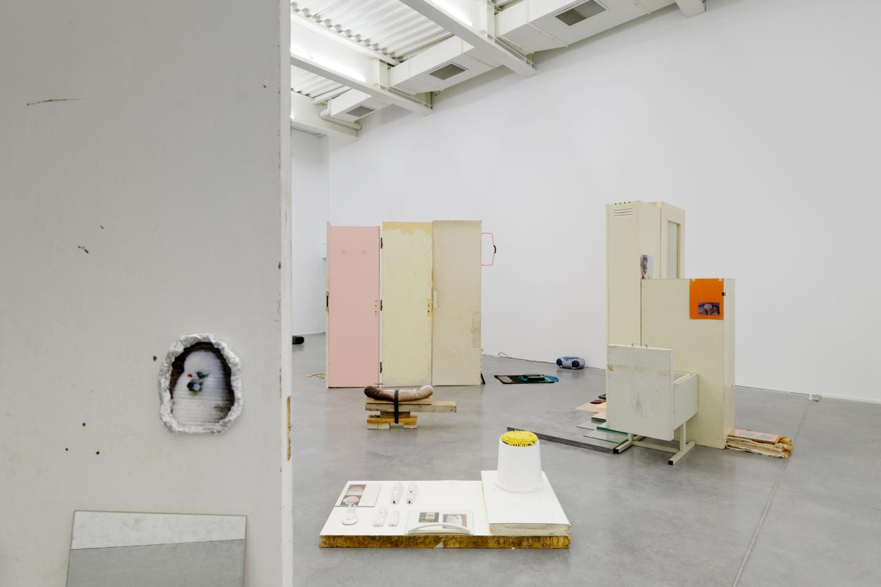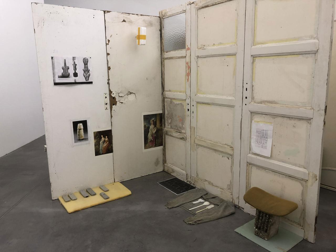 Folded in half on the floor, a scratchy cream bath towel serves as a plinth for a series of ice scrapers. Carefully arranged, the varied shapes evoke a new kind of hieroglyphs. Immediately beside this strange convergence of uses—bodily hygiene and automotive visibility—a modest collection of flat screwcaps are strewn on the ground like forgotten coins, with their deliciously antiquated gilded halo. Compelling in its nonchalance, this detail of the assemblage appears amidst a succession of doors, windows, and partitions that create alcoves, corridors, thresholds, and such. The makeshift architectural forms give a certain rhythm to our transit through this space, a hybrid between the ruins of a soviet building and an ikea display: the Swedish brand’s central concept is to give the illusion of multiple choices for the interior of the same house. Francesco Finizio calls these multiple entry signals that punctuate his labyrinthine installation Go Ghost ! (2021) at Frac Bretagne “punch lines,” witticisms or Freudian slips dictated not by the interplay of language but by the objects themselves.