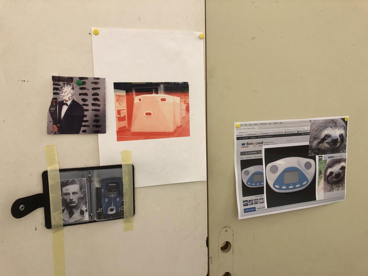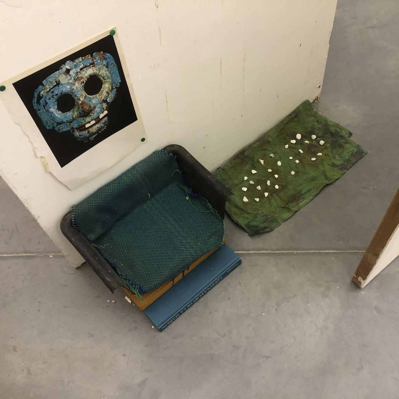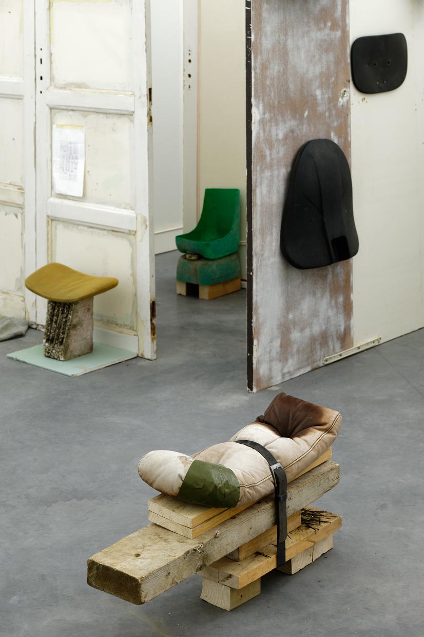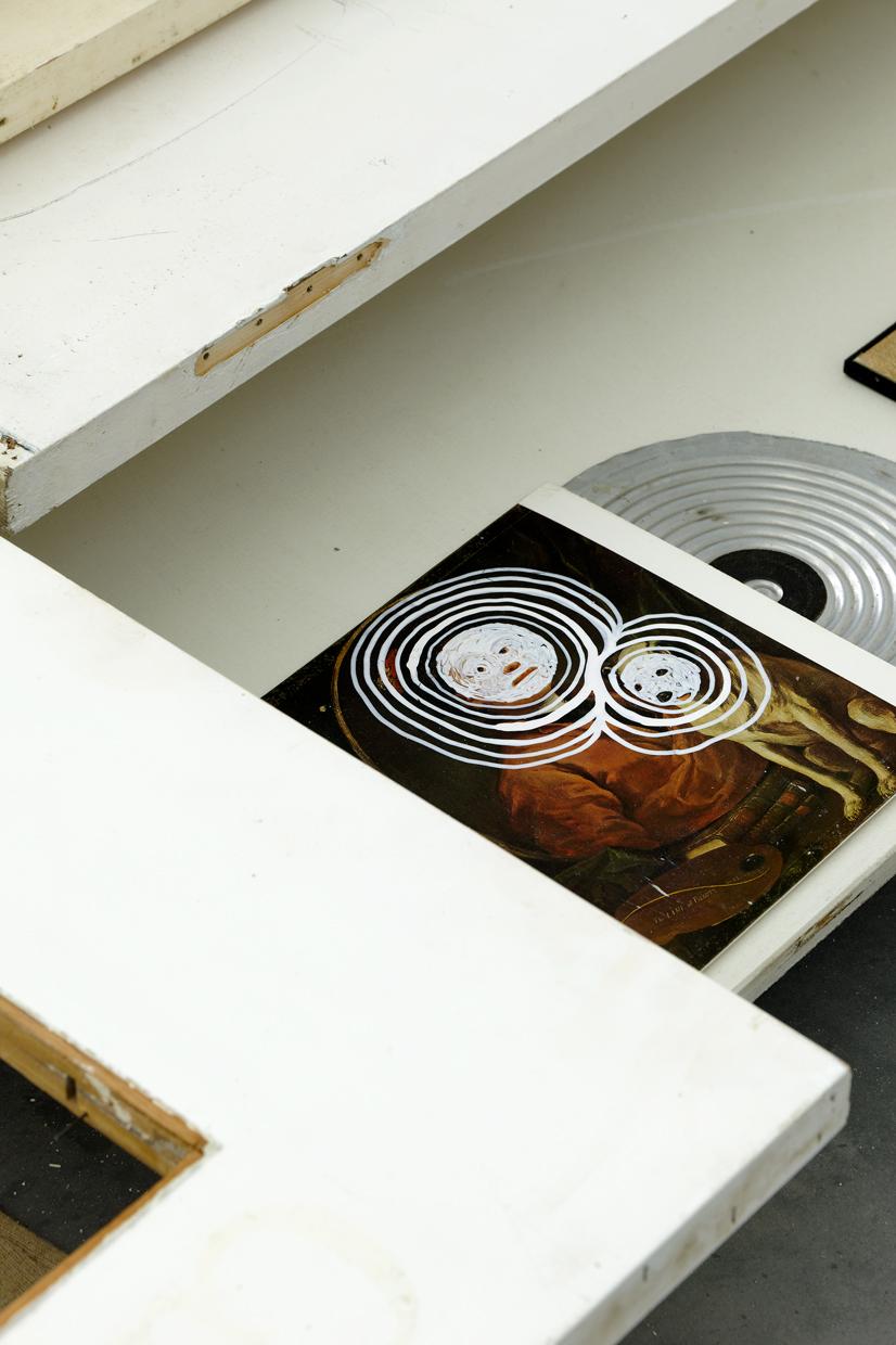 Folded in half on the floor, a scratchy cream bath towel serves as a plinth for a series of ice scrapers. Carefully arranged, the varied shapes evoke a new kind of hieroglyphs. Immediately beside this strange convergence of uses—bodily hygiene and automotive visibility—a modest collection of flat screwcaps are strewn on the ground like forgotten coins, with their deliciously antiquated gilded halo. Compelling in its nonchalance, this detail of the assemblage appears amidst a succession of doors, windows, and partitions that create alcoves, corridors, thresholds, and such. The makeshift architectural forms give a certain rhythm to our transit through this space, a hybrid between the ruins of a soviet building and an ikea display: the Swedish brand’s central concept is to give the illusion of multiple choices for the interior of the same house. Francesco Finizio calls these multiple entry signals that punctuate his labyrinthine installation Go Ghost ! (2021) at Frac Bretagne “punch lines,” witticisms or Freudian slips dictated not by the interplay of language but by the objects themselves.