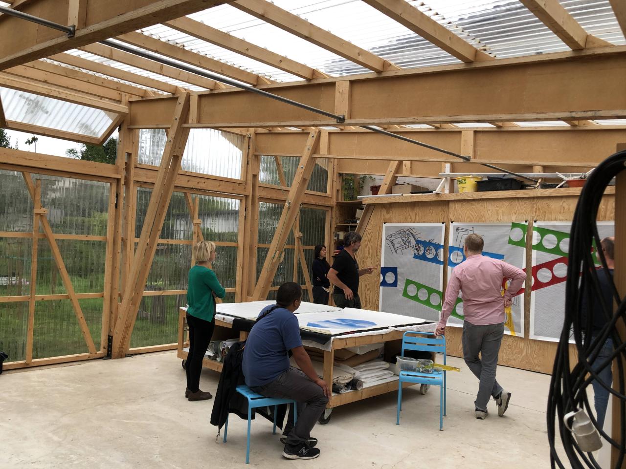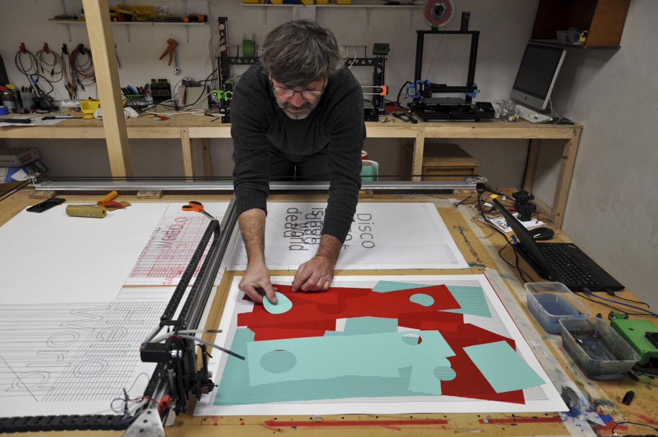 A gate opens onto a short gravel drive leading to a garden. To the right is the artist’s greenhouse-like studio. The entirely self-built wooden structure, covered with transparent corrugated panels, is comprised of three spaces: in the largest (unheated), the artist produces and exhibits large-format works; at the back, divided into two spaces, is a storage area, and a small heated room storing various machines, materials and supplies, with a plotter at its center occupying almost all the space. The site, made from scratch by the artist, naturally retains a certain do-it-yourself aura. As in Matthew B. Crawford’s Shop Class as Soulcraft: An Inquiry Into the Value of Work, Blanchet takes an active interest in machines, leading him to examine their mechanics, tinker, modify and adapt them to the needs of painting.