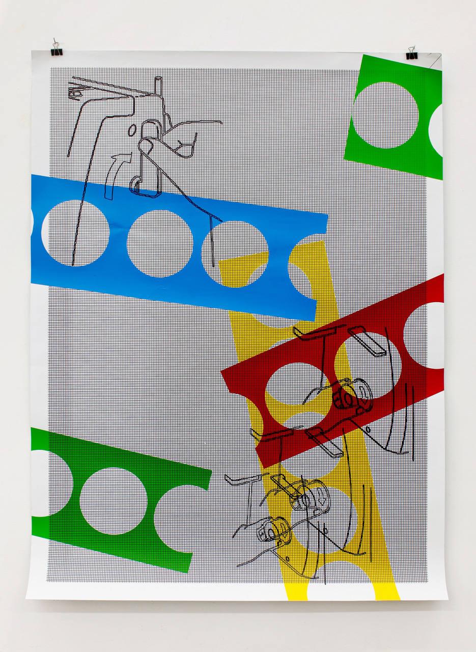 While he sets up partly automated computer processes, the artist does not remain a spectator of the machine. He programs it, shuts it down, restarts it and interacts with it. A mediation is established. In this context, hands are not ruled out, they remain present in the active process of formalization. Neither is complete automation of procedures Blanchet’s ideal; rather, he seeks the right distance and presence of the various factors that constitute the work. In the series Fantôme, he orchestrates the meeting of manual gesture and the mechanical ballet of the machine. The colored forms are quickly placed by hand. The work takes place live in the imminent act of doing. The body acting and the senses perceiving are entirely caught up in the action. Taking out two rolls of adhesive tape, he starts a freehand cut out of large colored areas. His actions are not predetermined.9 His approach is deliberately empirical, since for him: “discovery comes from doing.” But make no mistake, this spontaneity bears no similarities to the expressionist gesture. The hand is not expressive here. That would add too much of a psychological dimension, which he repudiates. Instead he seeks to create movement with the tools, or to achieve what he calls “tool gestures” (le geste de l’outil). Thus, at times the hand plays a role in unjamming the machine, it refills the ink, corrects a line, or bypasses the programming to produce more accidents. In Print10 (2018), hands—a rare figurative element in his paintings—are drawn. As recurring elements of instruction sets and user manuals, the figures remind us of their active and necessary role in accomplishing technical gestures in artificial and technological environments.