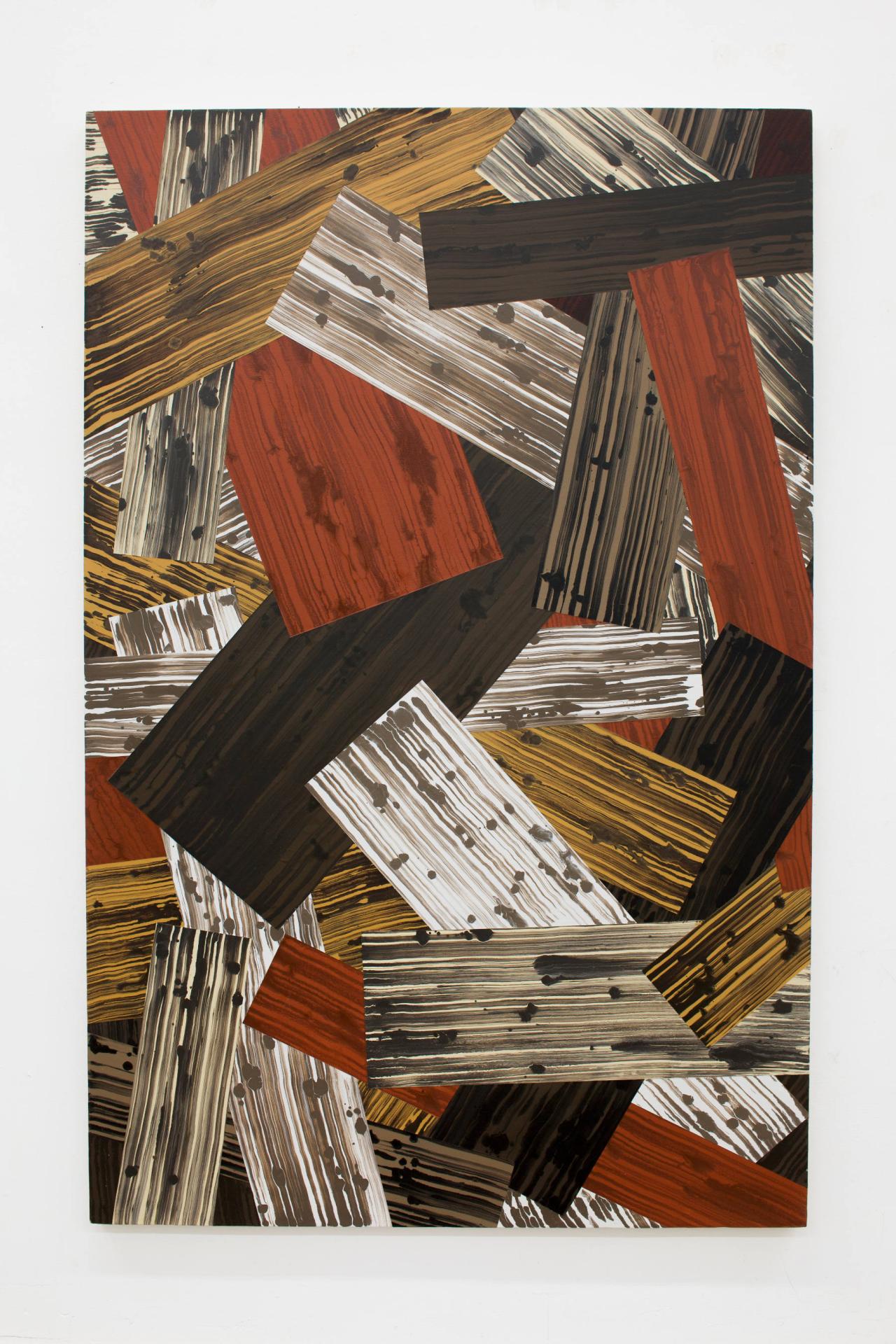Blanchet’s work actualizes certain aspects of an environment familiar to him since his childhood, paying tribute to working-class culture. As in his early painting (Grilles, 2003), his interests lie in industrial paint, in pots used for decoration found on the shelves of hardware stores, bringing readymade domestic hues into the realm of art. He also finds a certain beauty in the semi-finished products of industry, in commonplace equipment that can be repurposed. This interest in industry and the domain of labor, the working-class world of mass distribution and home improvement, is also a way of contributing to the task of breaking down the old but persistent distinctions between “major” and “minor” art. His taste for the faux (imitation leather or wood), as in Wood (2014), Simili (2011), Rustique (2010) or Formica (2009), is similarly motivated. He cultivates it as much as denounces it, puts it to use as much as he over-signifies to upset the established order. Irony and transgression emanate from his productions, which touch on Duchamp’s ready-mades and Roy Lichtenstein’s painting, when the painterly gesture makes an image.
