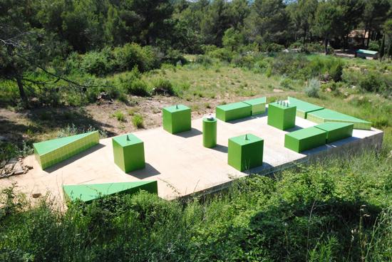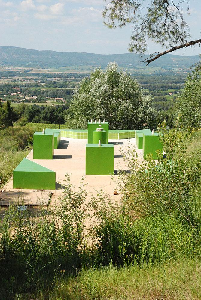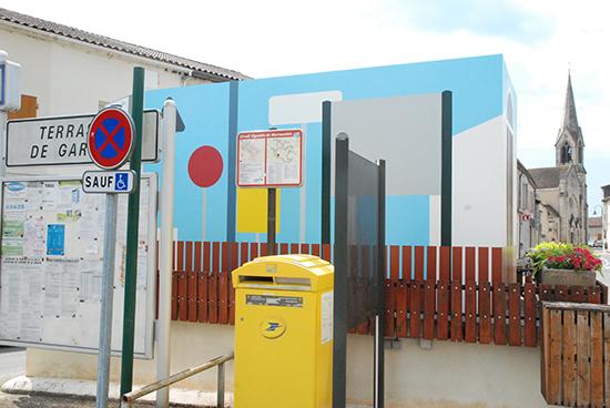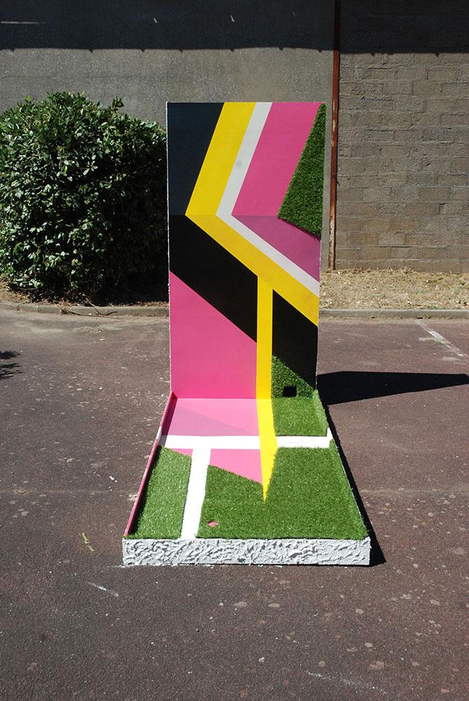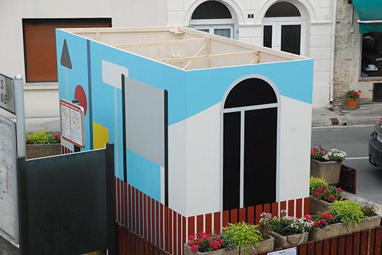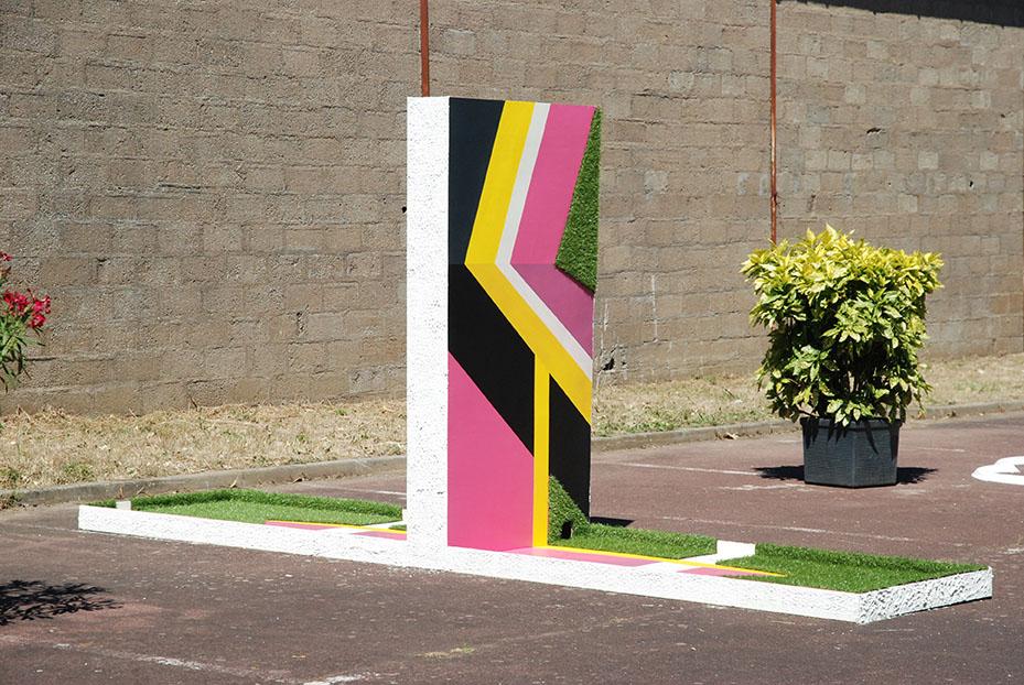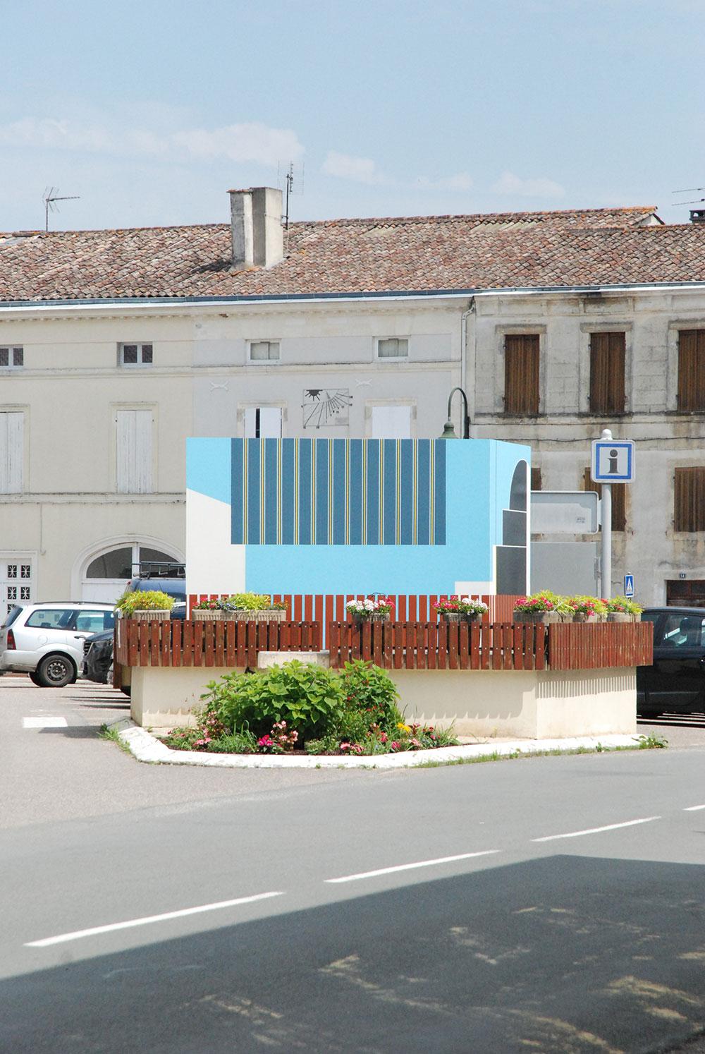 Recently, at Cocumont, for the exhibition “Artere, circulez tout est à voir”, Jeanne Tzaut proposed a “world of simulation”, titled Cabinet de curiosités, a mixture of sets and real elements in one of the town’s central squares. With its optical and colourful interplays, this work finds a reality dialoguing with the urban space which is removed from any functionality. In trying to exhaust the form and playing with the volumes, these absurd façades, with their diagrammatic urban furnishings, create a décor with painted and architectural motifs.