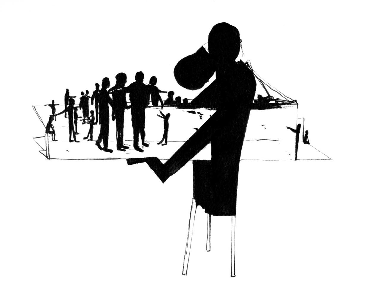 O.N. tells me about himself, he talks about love and wage earning. He talks about AIDS, about partying. I am caught in an expanse, and this expanse is the result of passage and transition, wherein relationships are managed and social statuses are defined. O.N. describes the figures that populate his drawings, whether waiters or traders, same clothes, same people.