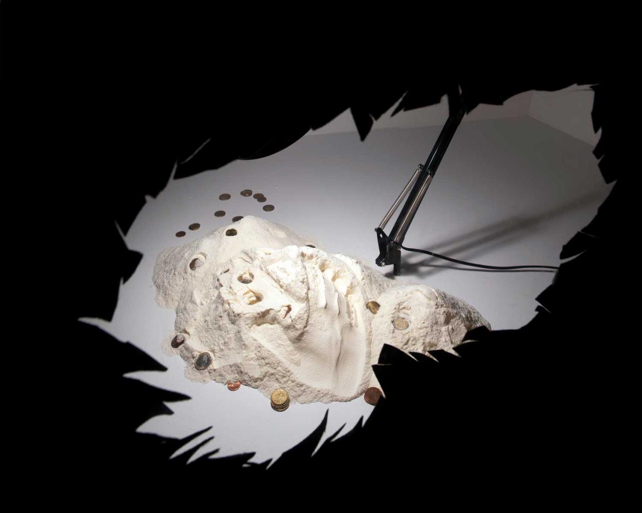 Flour, felt, coins, lamp