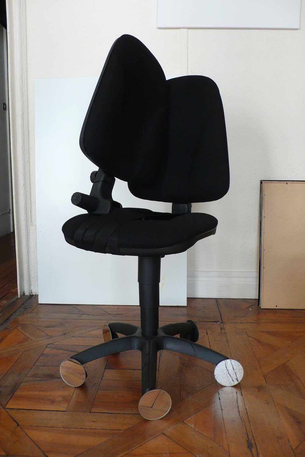 I remember the time when I hadn’t at all processed that everything dies, I remember being there in a green waiting room, a TV was broadcasting that day’s horoscope on loop, and I was deeply in love with life, frozen before tragedy: between the accident and slow agony, there is survival. A few leaves [Quelques feuilles] 2014, a double-backed office chair, each of its legs fitted with a small mirror. A stimulus in the perspective of vision: wonderment, love, desire, hope; that is, the threshold of death and devastation; that is, the threshold of a kiss.