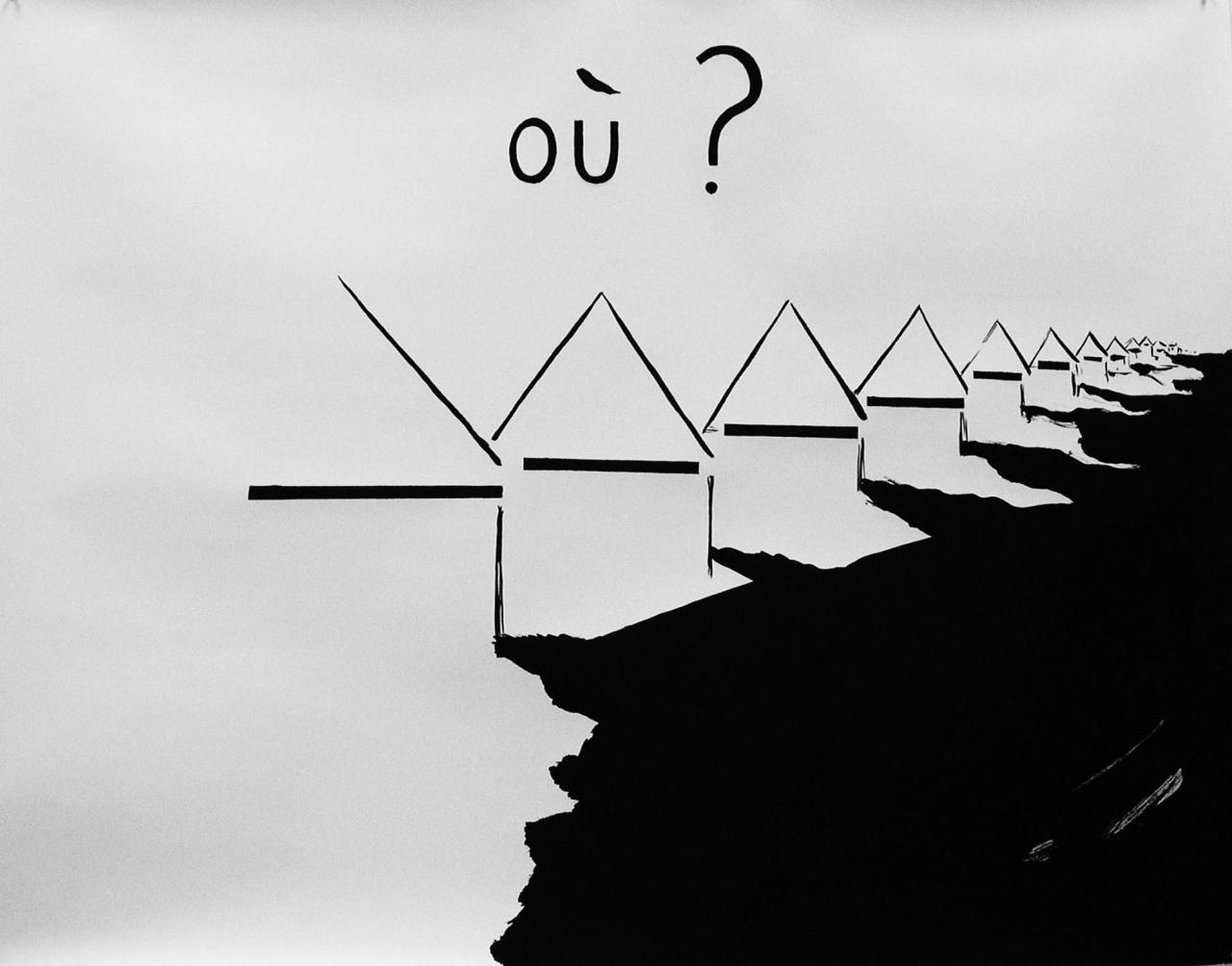 A white surface in a row of houses, or rather three times four lines that could be houses or the view from the beach in Le Havre, those little huts above which is written: WHERE [OÙ], to which I answer: in the car, I wanted to qualify the emotion, the setting sun, I thought about waiting rooms, which ones — the one in the hospital, at the job centre, at the benefits office. Perhaps there are some tasty moments after all.