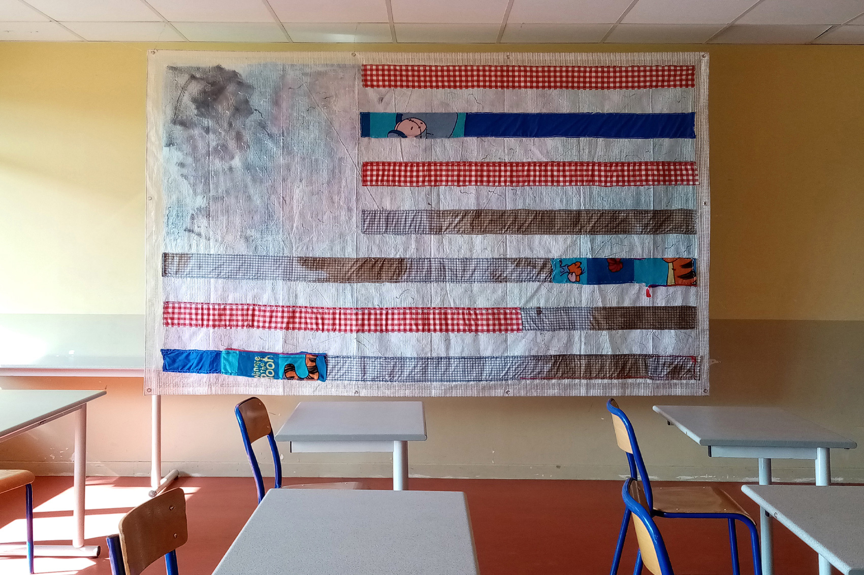 While he unrolled his Arches, sleeping bags onto which colored forms are sewn, he spoke of his adolescence, the skatepark, flexibility and gliding. He spoke of high school, and a time in which he’d defeated boredom, collecting at school all sorts of objects that lay around to make sculptures in classrooms and in the courtyard very early in the morning, before anyone had arrived, because he was already unable to sleep. Refolding the sleeping bags, he described some of his works with his voice from beyond the grave.