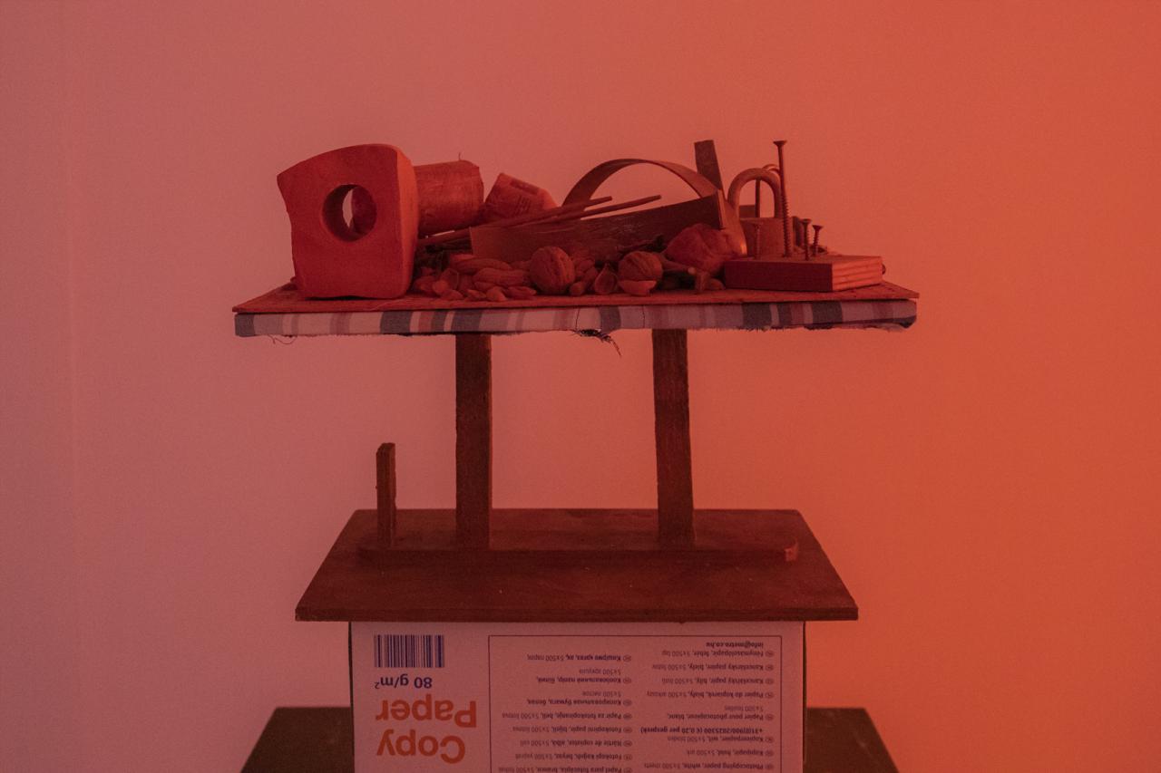 The context made me cautious. In front of a video projection depicting an eye, three sculptures were lined up, the smallest at the front, the tallest at the back. The enormous eye winked softly and I didn’t know how to look at what I was seeing. Set upon trays with different bases, things like pistachio, peanut and walnut shells were piled up as on the coffee table of an obsessive teenager or a psychopath. Everything was red, not just from the light of the video projector flooding the installation—the objects were painted red, with oil and brush, in a confusing redundancy. I hadn’t yet seen these pieces, neither on his website nor in his portfolio. In fact, he’d just made them—for me, he said. That scared me too.