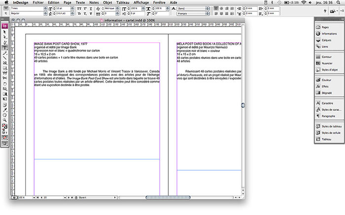 Information is the second research project I carried out at the CDLA residency. It came from a desire to understand publishing space as curatorial space. Even if the question of the “book exhibition” was clear in my mind, I quickly started asking myself if all publication wasn’t able, finally, to play the same role of exhibiting works, in the sense that it shows an art object or a body of work brought together in the same space. Furthermore, the question of the “editor” (in the Anglo-Saxon sense of the word) also emerges: is the editor a curator? I thus decided to use a simple rule, a work method I could apply to any publication, at the CDLA as elsewhere. From this moment on, I decided to consider a publication as an exhibition, starting from the propositions defended in each one: as soon as the intention to create a printed exhibition space is mentioned, questioning the role of the gallery or proposing that the artist consider the space of the page as a space of displaying in its own right, then the book can be considered an “exhibition book” because that was its initial intention rather than a subsequent viewpoint or personal reflection on the creation of the object observed. Starting from my exploration of the CDLA collections, Information was conceived around individual cards where the information relative to each publication can be found: title, year, organizer/curator, number of artists, number of pages, dimensions, printing type, and all other defining characteristics. In addition, I add an explanatory note on the work, written using the collected information.