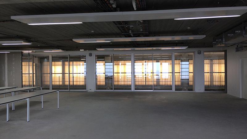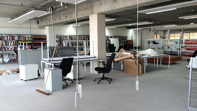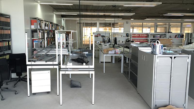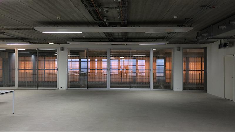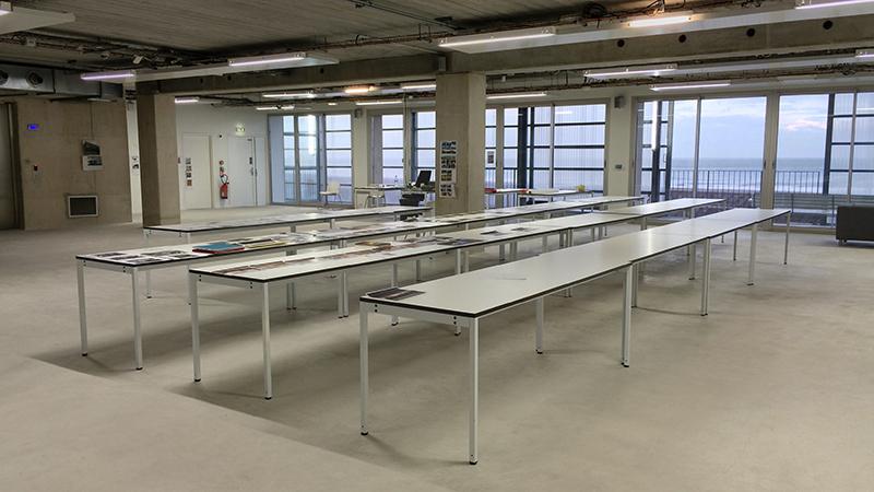 Une atmosphère tranquille de bureau, avec des parties où l'on aperçoit à la fois l'écume lointaine des vagues et les parois gaufrées et translucides de la « Cathédrale ». Ce vitrail de résine se transforme à cet étage en fragile luminaire de Noguchi. La lumière se dilue progressivement du nord vers le sud. Un balcon filant avec 4 volets coulissants translucides qui peuvent s'ouvrir sur la mer du Nord. Leur ouverture laisse apparaître en dentelle les garde-corps à barreaudages en acier galvanisé., éléments standards et récurents des projets de Lacaton et Vassal. Du mobilier de bureau industriel: 21 tables de 210/70, 30 étagères métalliques avec et sans fonds. Une longue bibliothèque remplie d'ouvrages. Une hauteur sous plafond basse mais qui laisse pas mal de souplesse dans les cloisonnements. Un espace de projection déjà existant autour duquel s'enroule l'espace libre. Plusieurs entrées possibles sur le plateau. La cloison de l'espace dit « vitrine » pourrait être déposée pour créer un espace d'exposition plus important. Et le balcon deviendrait ainsi un espace d'exposition comme au deuxième étage et non plus un cheminement d'évacuation en cas d'incendie. Des portes d'accès à des rangements et des escaliers adossées aux réserves sont peut être un peu trop prégnantes dans l'espace d'exposition, possibilités d'ajouter une paroi en respectant les normes pompier.