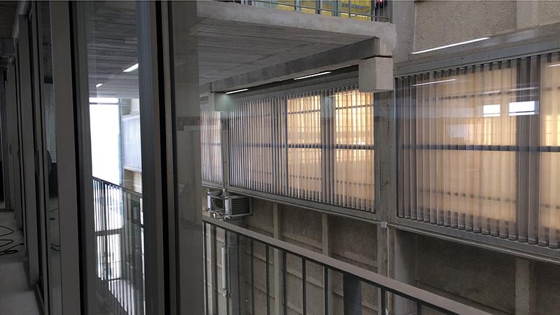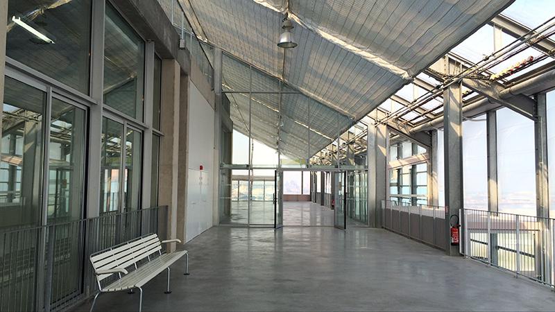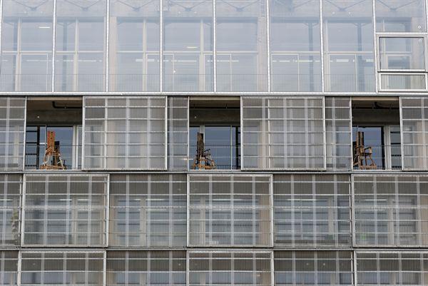 Parcourir les « entre deux », chers aux architectes de cet édifice, les balcons, les terrasses, les espaces « en plus ». Les espace chauffés non chauffés, ensoleillés, à l'abri de la lumière. On y passe grâce aux coulissants vitrés que l'on retrouve aussi dans les logements de Lacaton & Vassal à Saint-Nazaire ou ailleurs. Ouvrir ces coulissants, franchir ces seuils, c'est comme être un peu chez soi et décider d'aller prendre l'air sur le balcon, dans la loggia, sur la terrasse, pour profiter du temps, de la vue.
