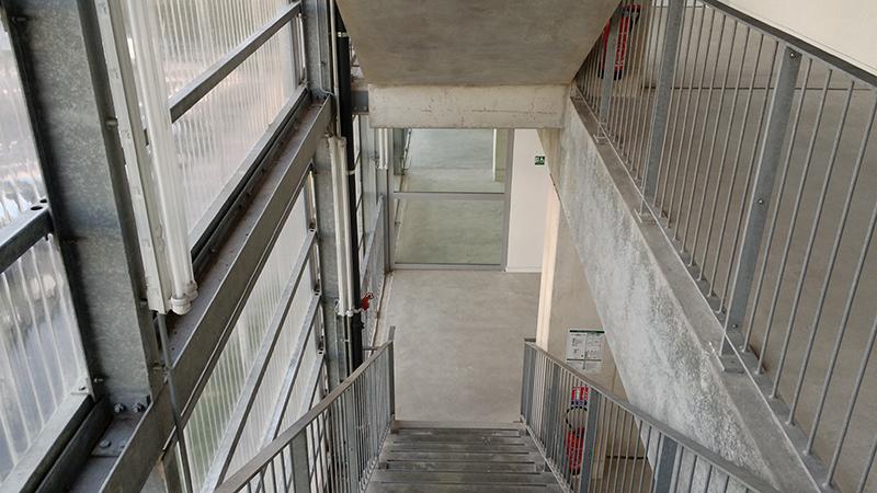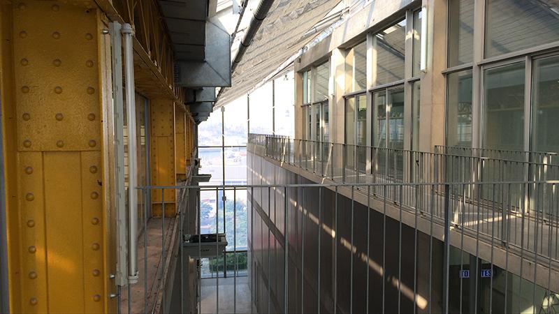 On redescend. Pour revenir à la « rue » qui traverse le FRAC, elle donne plutôt l'impression de passer près d'un dessous de pont, mais elle apparaît au 1 étage, pour l'instant sans usage, de plain-pied sur certaines salles. D'ailleurs ce serait plutôt un passage qu'une rue. Oui c'est un passage, celui décrit par Walter Benjamin ou la ville de Fourrier faite de passages, la « ville en passages », le lieu du flâneur.