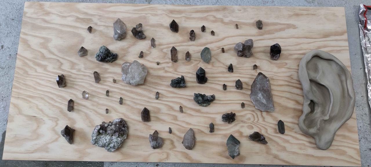 Inspiré par la figure du cristallier, je développe une installation composée d’un film tourné en haute montagne, de créations graphiques et de volumes. Pour dialoguer avec la montagne, j’aimerais réaliser des céramiques représentant des parties de corps humains liées au langage. D’autres pièces, conçues à partir de matériaux et d’outils bricolés utilisés par le cristallier, sont pensées comme des formes hybrides entre costume de scène et vêtement d’alpinisme.