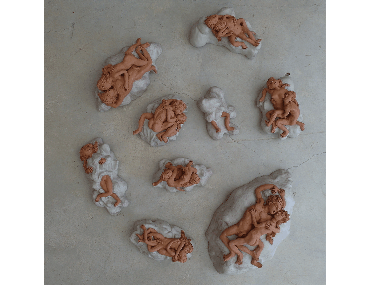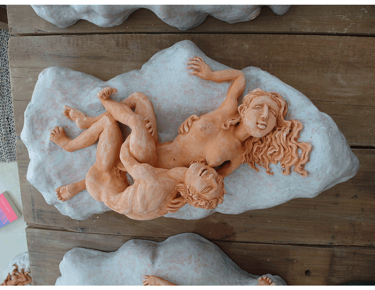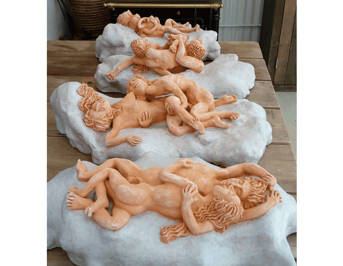 He invited me back to Garzon to make a ceramic light fixture. We decided to continue with nudes, unglazed figures on glazed clouds.