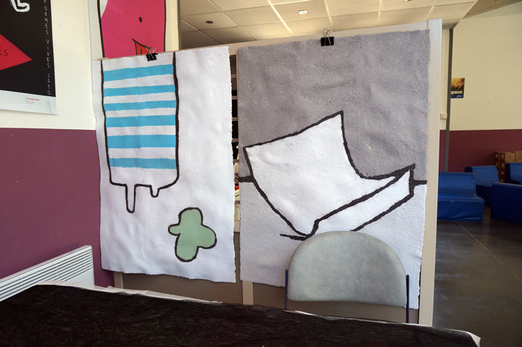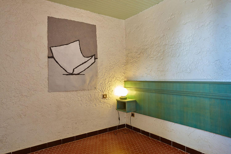 Les peintures sur papier ont été exposées dans des maisons-bungalow.