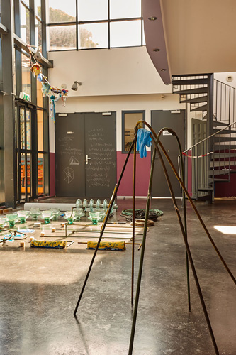Les objets collectés sur site ont été disposés sur le sol dans le hall d'entrée de l'espace de vie. Cet inventaire est une première étape pour Victoire Barbot, préalable à un travail pour une mise en volume des éléments en équilibre. Cette deuxième étape n'a pas pu être réalisée faute de temps et pour des raisons de sécurité.
