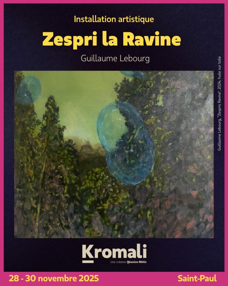 Zespri la Ravine est une installation immersive qui explore les ravines de La Réunion comme des interstices de mémoire où oubli et transmission se rencontrent. Le décor fragmentaire — parois, racines, ombres et sons diffus — vous invite à pénétrer un espace fragile entre réalité et imaginaire. Les Refuges des entités incarnent des récits effacés, tandis que les sons de la nature mêlés à des voix ouvrent un dialogue intergénérationnel. L’œuvre questionne la fragilité du monde, la transmission des histoires et la façon dont ces interstices révèlent des fragments d’existence en transformation. Elle se prolonge par une performance où créatures et messagers surgissent des ravines pour transmettre au public une mémoire collective vivante.