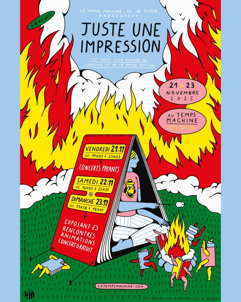 Juste une impression, en fait, ce n’est pas juste une impression, enfin si… mais nan. Comment définir ce rendez-vous ? C’est la fête des fanzines, des affiches, de la BD, et de la micro-édition en tout genre qui convie une trentaine d’acteur·rices locaux et nationaux plus cool les un·es que les autres. Le Temps Machine se transforme alors en temple pas sérieux de l’illustration, propice à la découverte, l’échange et la rencontre !