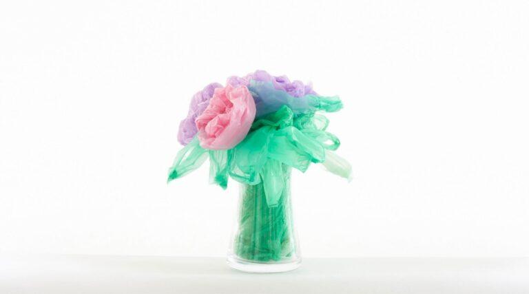 -les permanentes (2023), huit bouquets de fleurs composés de sacs plastiques colorés collectés dans des commerces de proximité