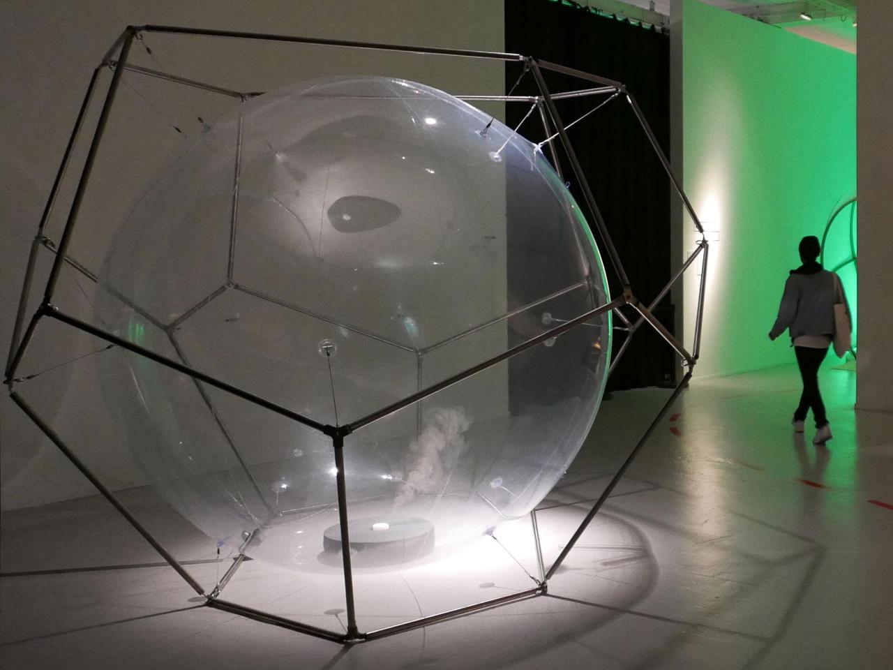 Métal, bulle PVC cristal, Ø 250 cm, corde, système de ventilation, fermeture éclair, diffuseur, flacon d’ocytocine (hormones), mousse, tissu